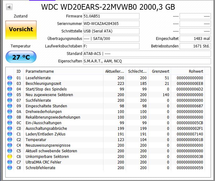 Habe mit CrystalDiskInfo die S.M.A.R.T-Werte ausgelesen und dabei hat es mir eine Warnung angezeigt, bei C6 Unkorrigierbare Sektoren.