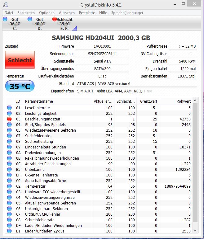 Die hat 599 schwebende Sektoren und dazu 675 wieder zugewiesene. Die würde ich so schnell wie möglich austauschen, zumal auch 70587 Schreibfehler registriert sind und die Platte mit 595036 schon fast die spezifizierten 600.000 P/E Zyklen hinter sich hat. Statt zu verschieben, was ja mit Schreibzugriffen verbunden ist, würde ich besser alles nur kopieren.