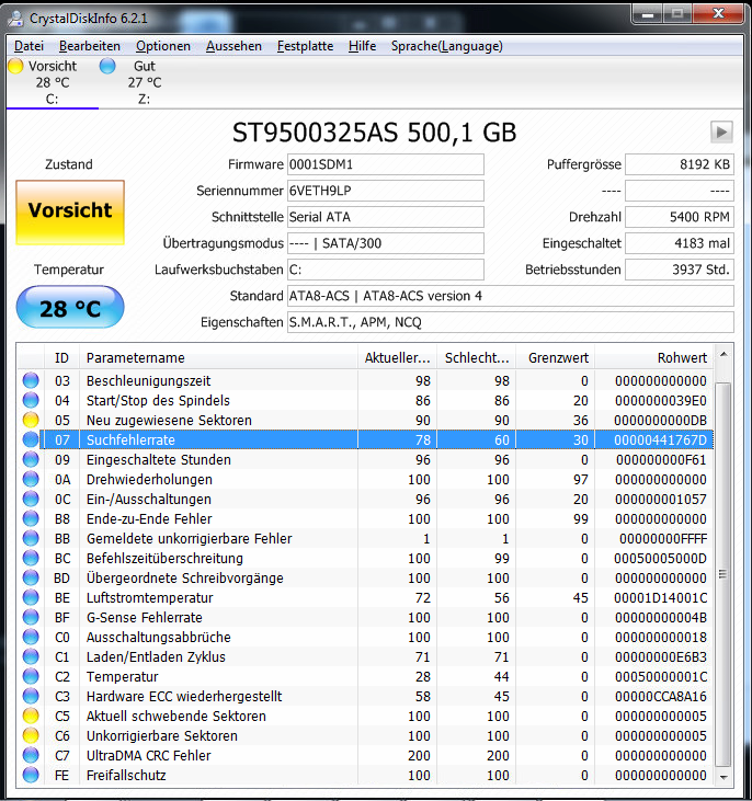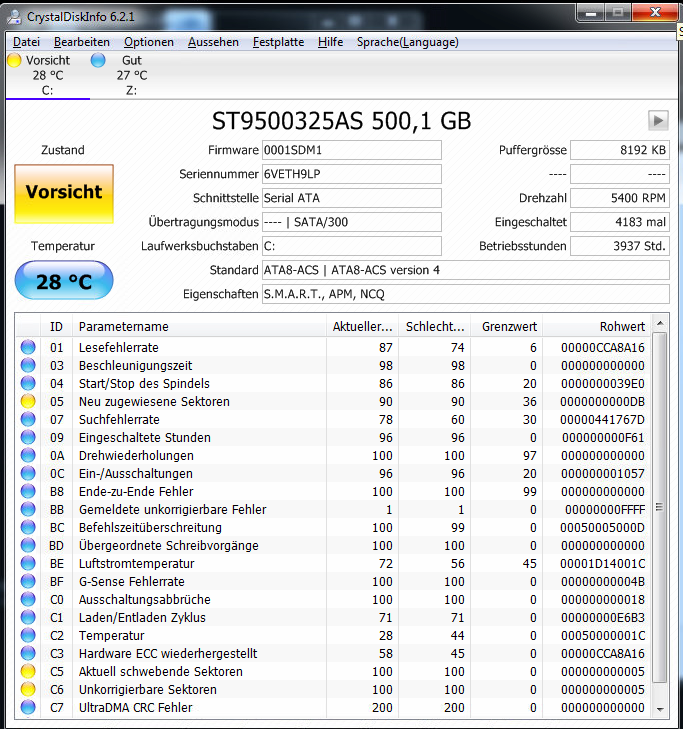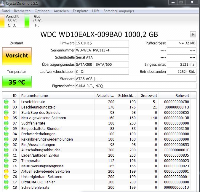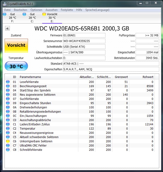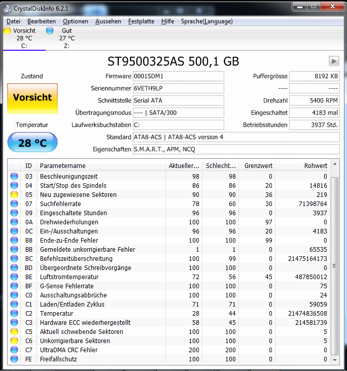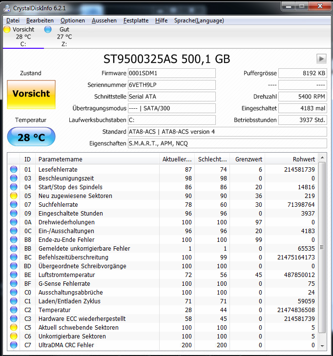 Die S.M.A.R.T. Werte der Platten sollte man regelmäßig überwachen, denn Windows meckert erst, wenn die Platte in den letzten Zügen liegt und CrystalDiskInfo schon "Schlecht" als Zustand anzeigt. Nicht selten gehen Platten kaputt, ohne dass überhaupt eine Warnung von Windows kommt.