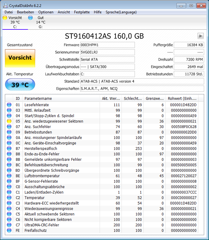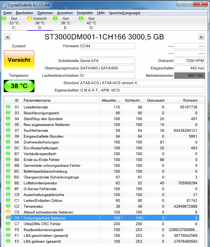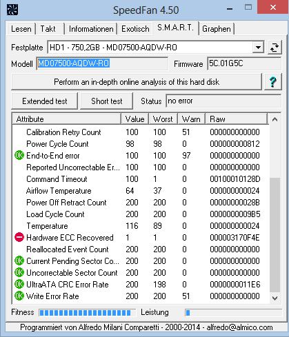 Fitness der Festplatte wäre 94% und Leistung 3%! Es gibt anscheinend Fehler bei "Hardware ECC recovered" . Was das bedeutet weiß ich nicht , auch meine Englisch Kenntnisse sind stark beschränkt. Weiß zwar, dass das ungefähr "wiederhergestellte Festplatte" heißen soll, aber mehr auch nicht.
