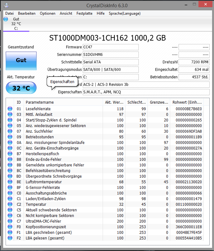Der G-Sensor hat 4605 mal ausgelöst, also zu schwere Schock ermittelt, die wurde auch schlecht behandelt und dafür ist nur ein schwebender Sektor und ein paar Lese- und Schreibfehler noch ein sehr guter Zustand. Für Notebooks die öfter mobil unterwegs sind, wäre eine SSD sinnvoller, da diese mechanisch solider sind.