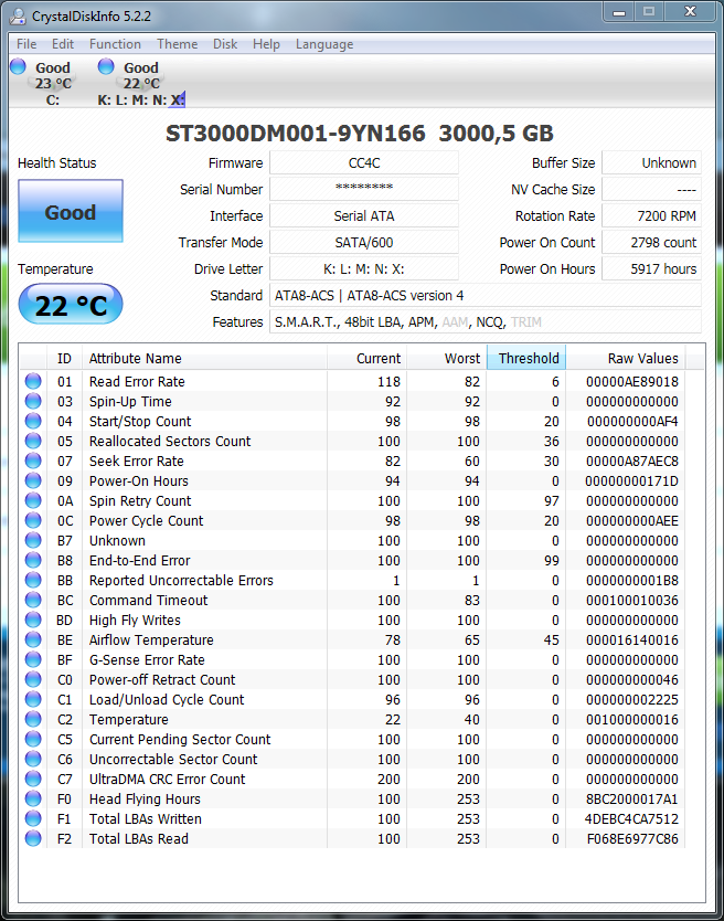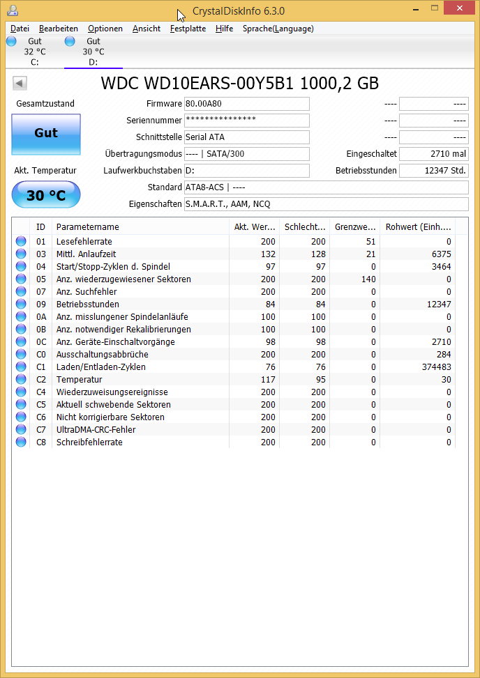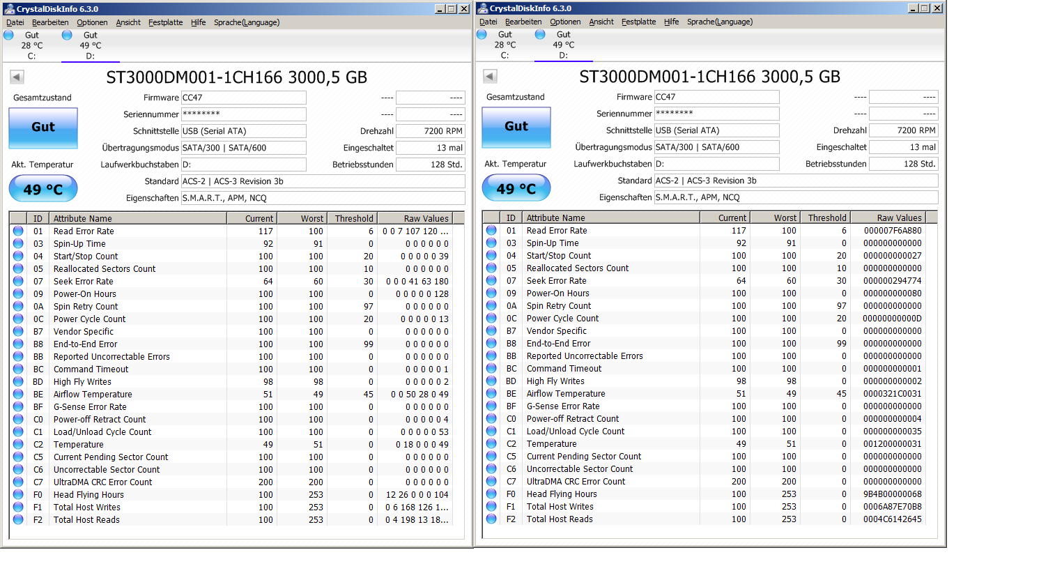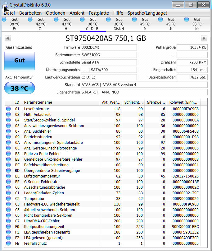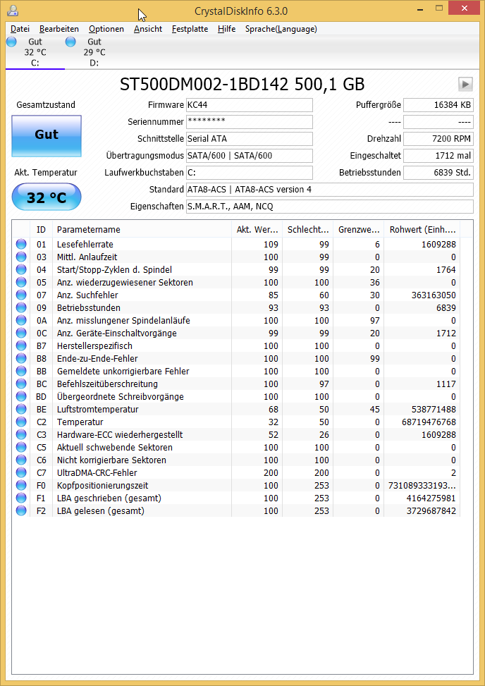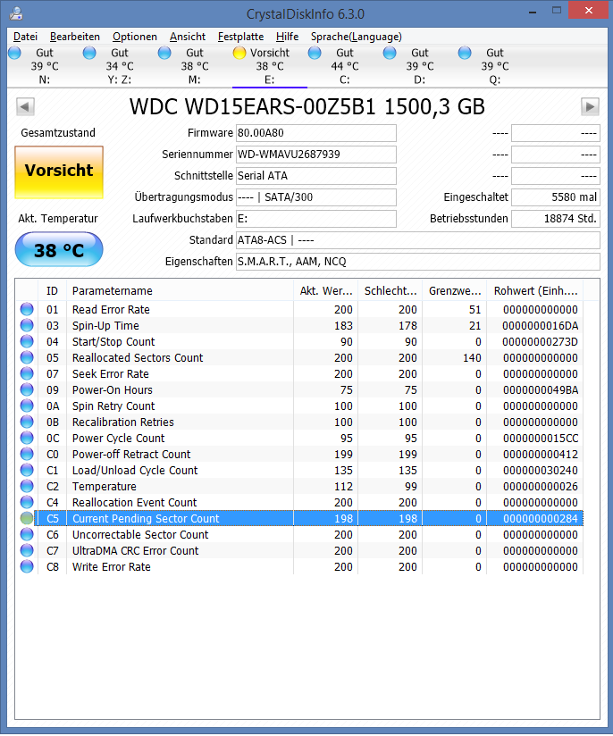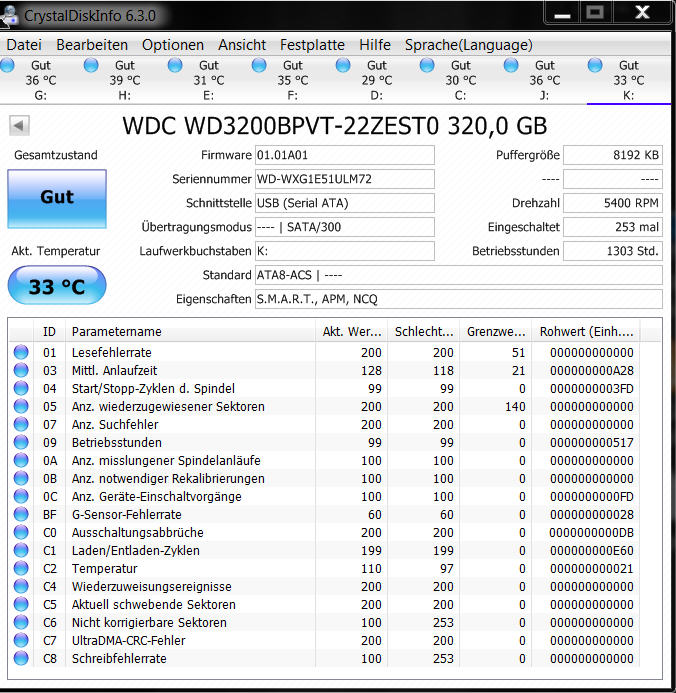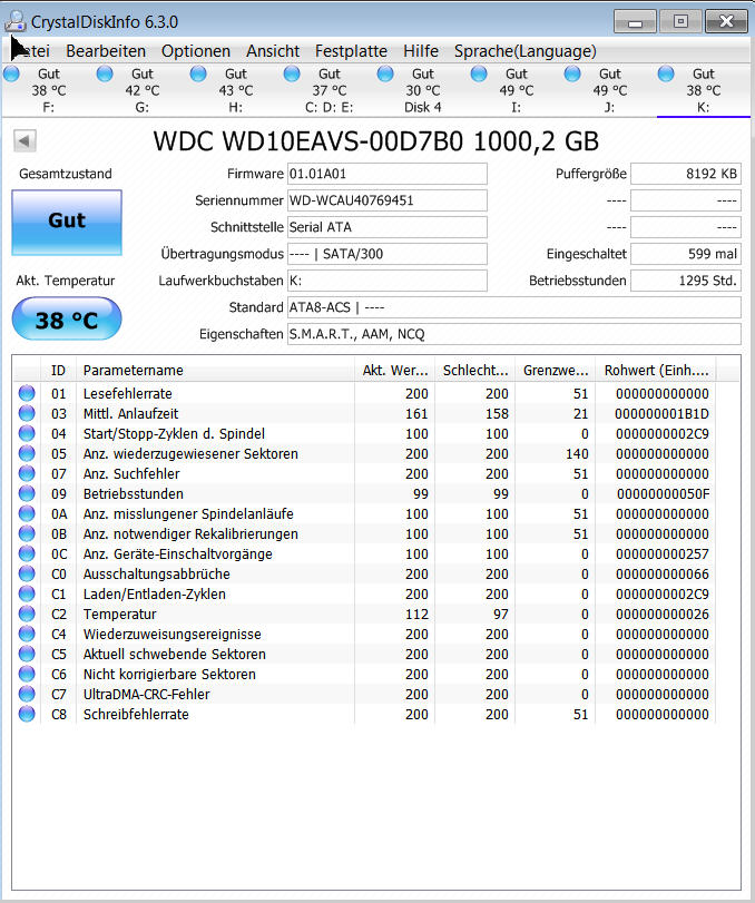 So nochmal mit Windows und h2testw geprüft, ohne Fehler. Die SMART-Werte aktuell: