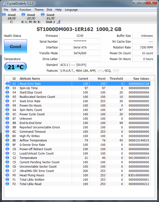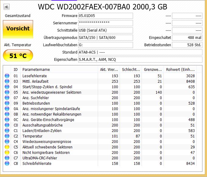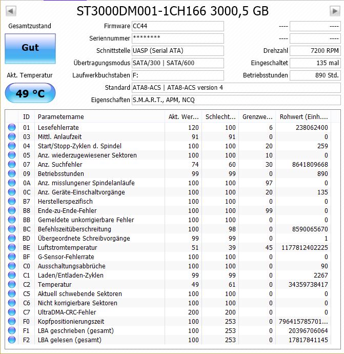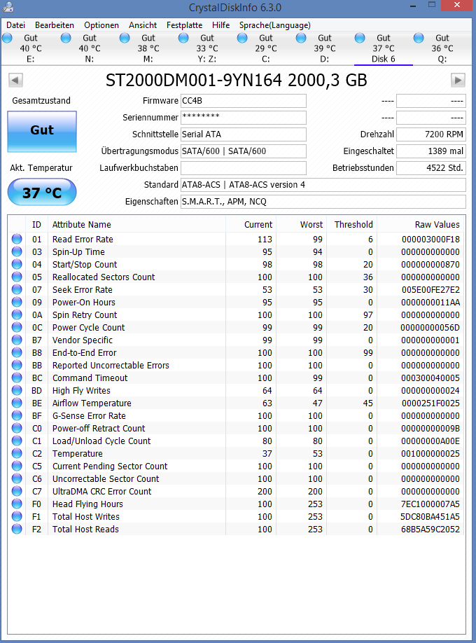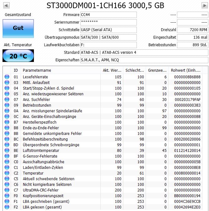Ich bin auf der Suche nach der Interpretation von ChrytalDiskInfo auf diesen Thread gestoßen. Da ich in der letzten Zeit schon einige Probleme mit zwei meiner externen HDDs habe, wäre ich für eine Interpretation der Werte sehr dankbar.