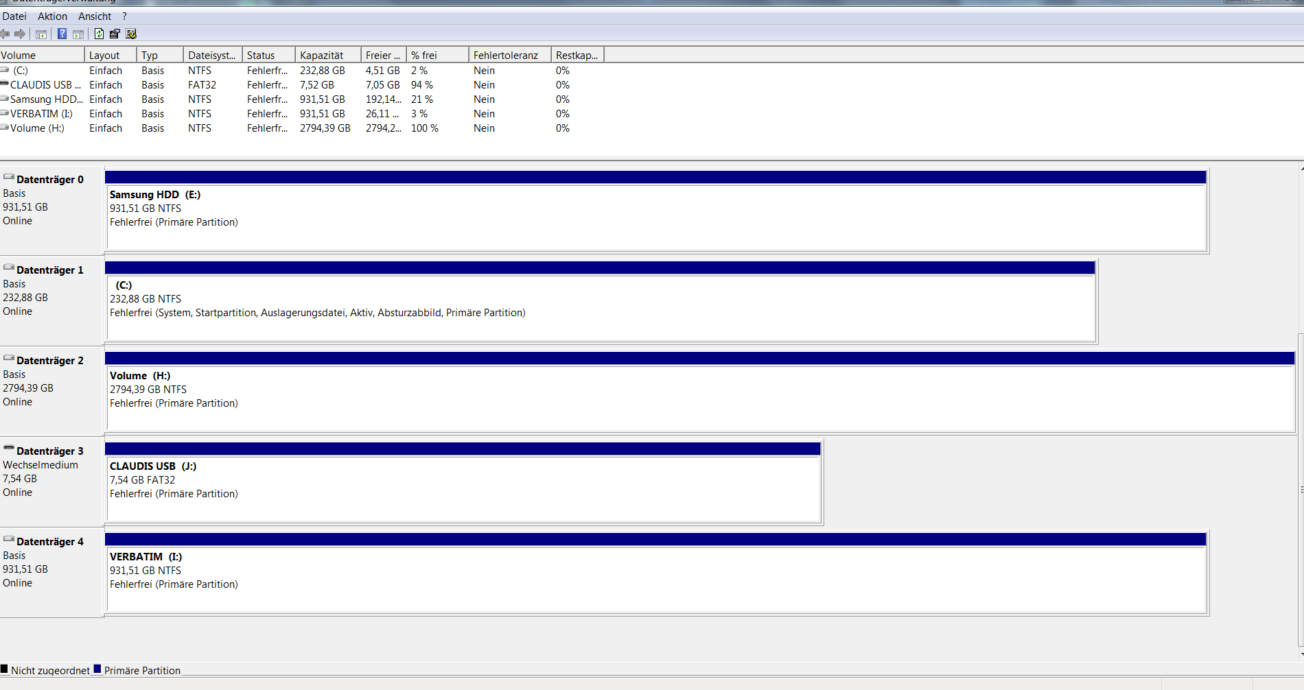 Doch in den letzten Tagen verschwand die Platte einfach so aus dem Explorer/Gerätemanager. Es war egal ob sie im Zugriff war oder nicht. Nach einem Neustart war sie wieder da. Es handelt sich um ein reines Datengrab, daher viel mir das verschwinden erst auf, als ich darauf zugreifen wollte. In der Eregnisanzeige (WIN7 Prof) habe ich keinen Hinweis gefunden.