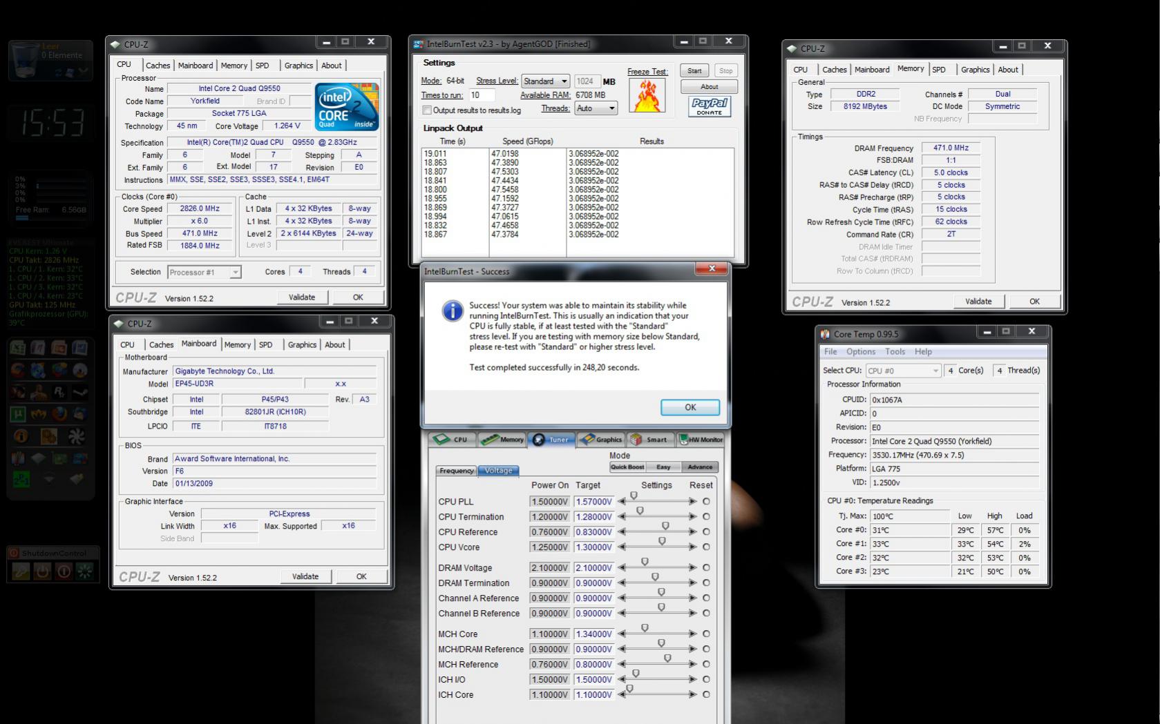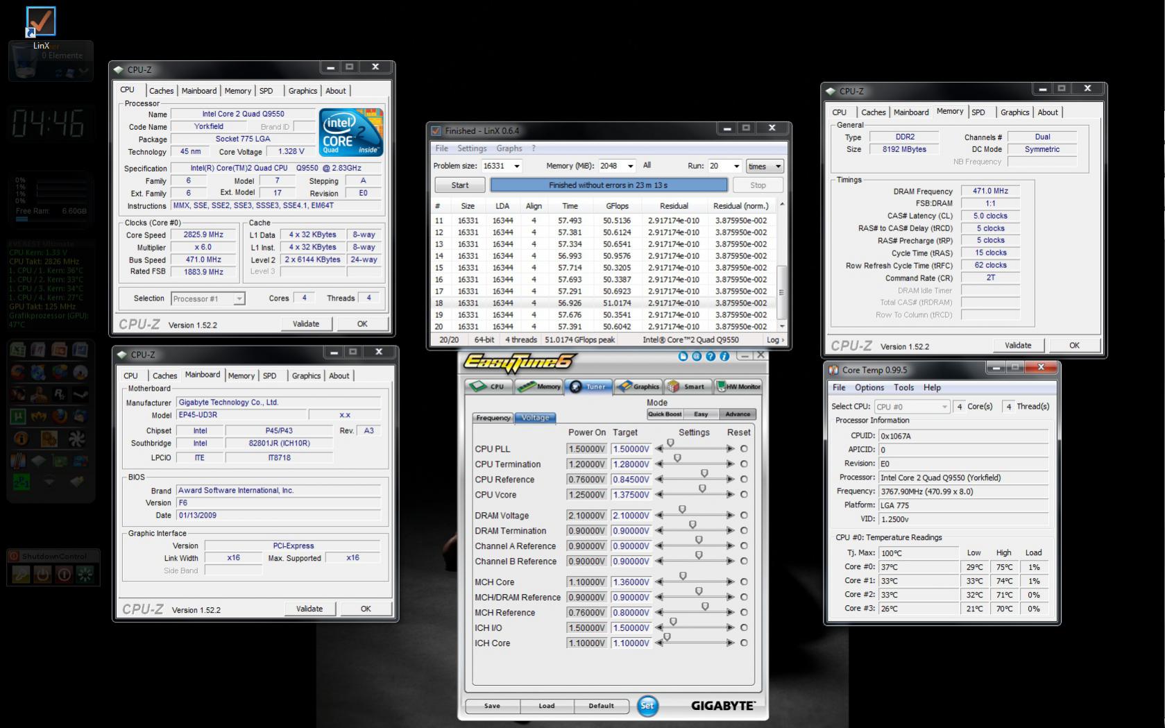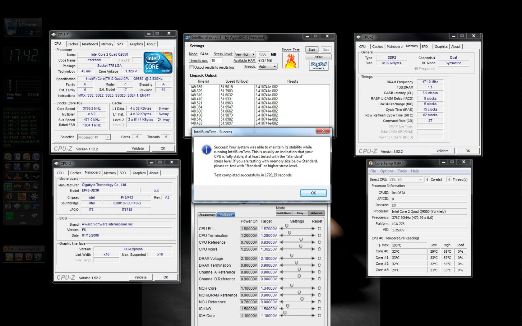 Ich hab schon mehrere Core 2 Prozessoren übertaktet und mein jetziges System hab ich schon seit Januar `09 auf 3.61Ghz übertaktet. Jetzt kam ich aus Langeweile auf die Idee meinen 4.0Ghz Plan endlich in die Tat umzusetzen. Entweder mit 471x8.5 oder 500x8(unwarscheinlich wegen Rambesetzung). Jedoch stoße ich auf viel mehr Widerstand als erwartet. In den letzten Tagen hab ich alle Werte außer VCore festlegen können für 471 FSB und wollte jetzt eigentlich den einfachsten Teil fertig machen: Vcore um anschließend 500x8 zu testen. Leider macht mir anscheinend der Prozessor einen Strich durch die Rechnung. Er verlangt für 4.0Ghz eine VCore außerhalb der Spezifikationen und weit über dem Durchschnitt.