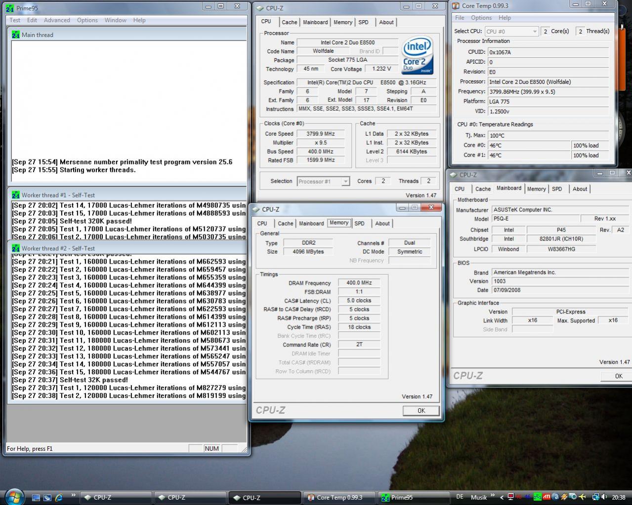 Mein E8500@ 4,00 Ghz läuft mit ner Last Vcore von 1.335 V seit einer Stunde unter Prime95 ohne Fehlermeldung bei nem DeltaT von 45 Grad.