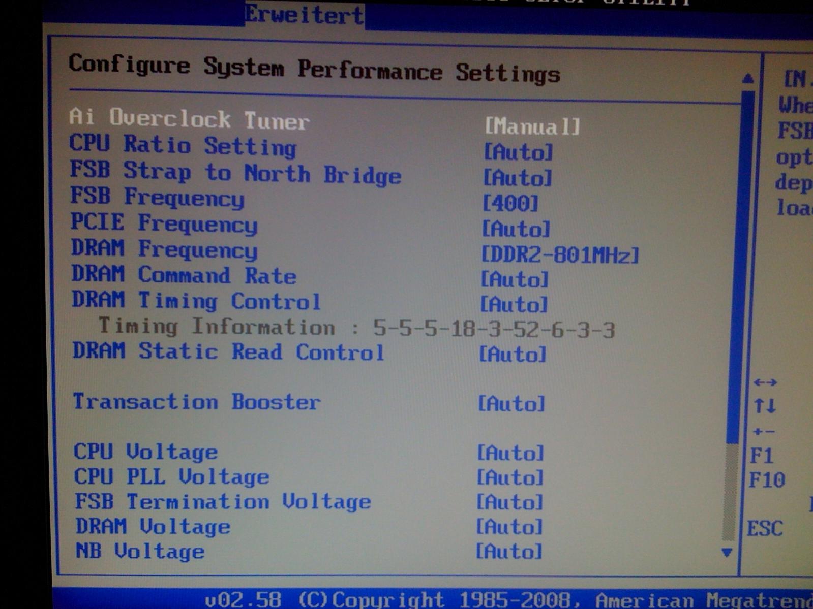 Ich habe angefangen meinen Prozessor zu übertakten. Es ist ein C2D e8500. Zur Zeit bin ich bei 4.085 Ghz. Die Spannung möchte ich nicht zu hoch setzen. Weil er noch etwa ein Jahr halten muss (Ich weiss das der Cpu höchstwahrscheindlich noch länger überlebt). Den Pc wird fast täglich gebraucht. Ich habe jetzt mal ein paar Fotos von meinen Biossettings gemacht.