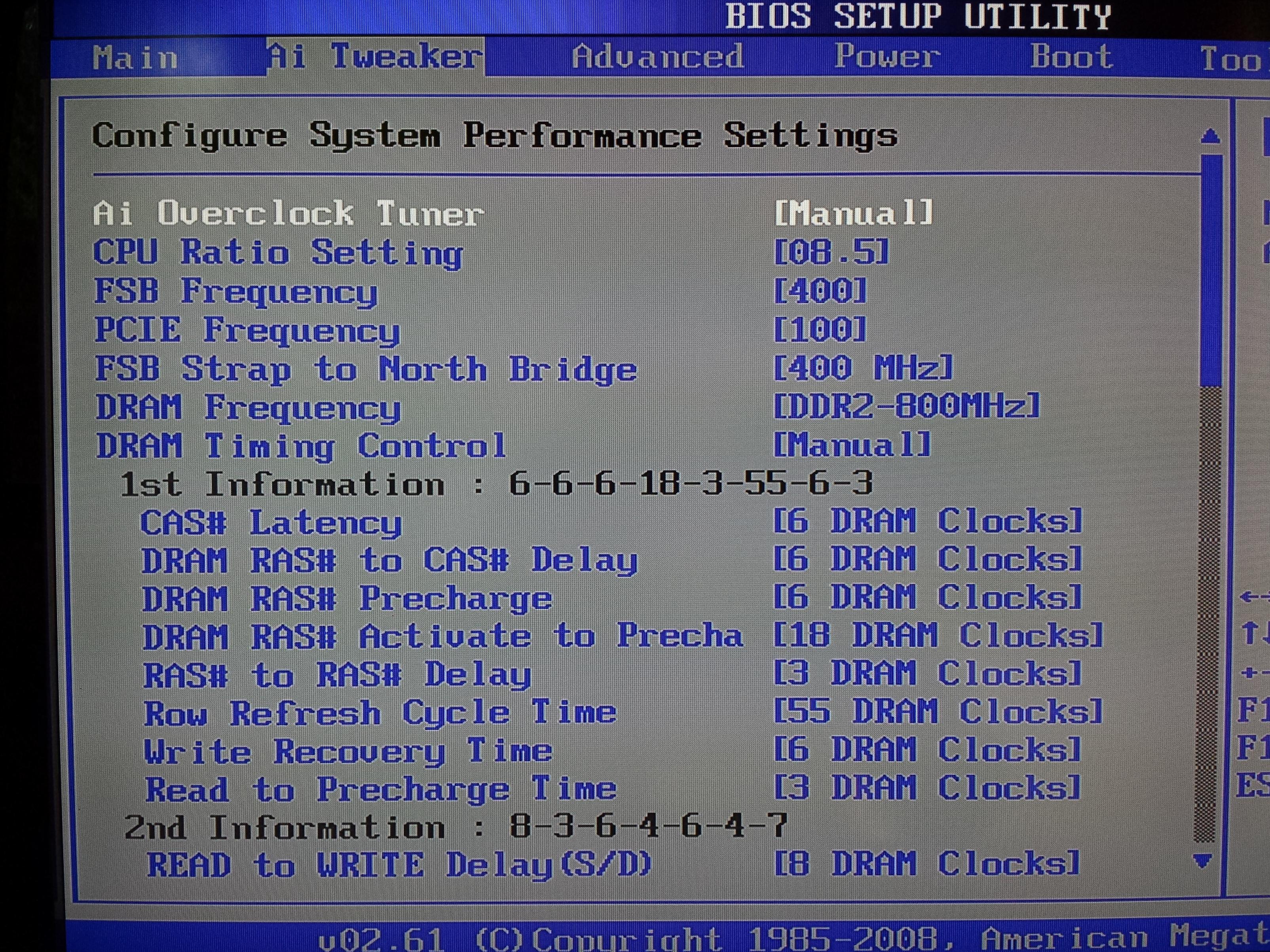 Daraufhin machte ich mich auf ins BIOS und stellte überall die Werte von "AUTO" manuell ein. Unter anderem auch den FSB auf 400 und den Multi auf 8,5. Genützt hat es rein gar nichts, es ist weiterhin so, dass er nach dem Energiesparmodus auf 400 x 6 läuft, obwohl im BIOS 400 x 8,5 eingetragen ist.