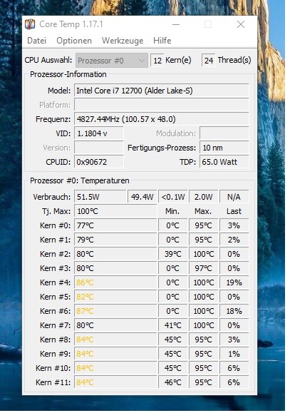 Der NH-D15 hingegen, sollte das eigentlich gekühlt bekommen und Alder Lake wird eben warm, wenn du 200 Watt durch die CPU jagst. CB kommt auf 86 °C, mit Default Power Limits, wenn ich mich nicht verlesen habe.