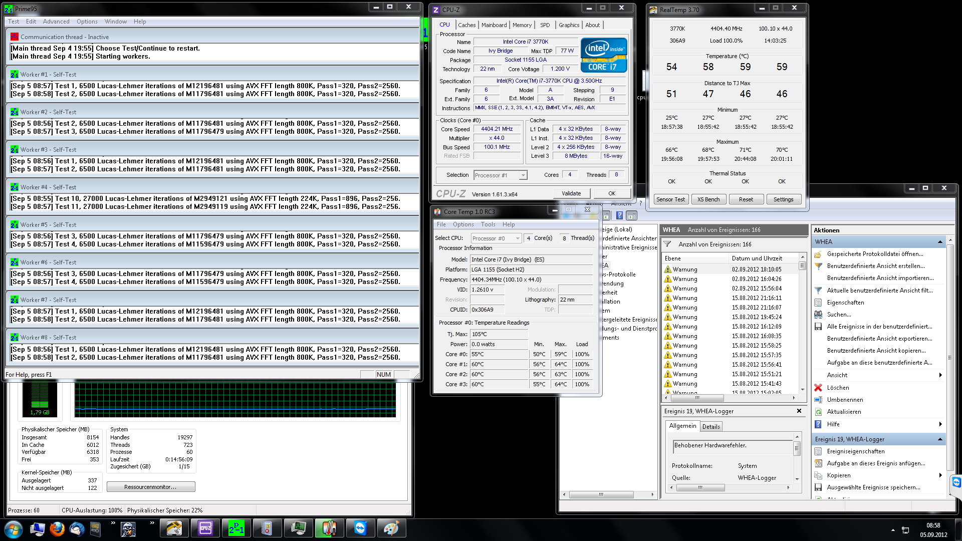 So, gestern habe ich rund 2 Stunden BF3 gezockt und danach 12 Stunden Prime durchlaufen lassen. Es gab keine Fehlermeldung im Programm selber, keine Abstürze des Systems und auch keinerlei WHEA-Logger-Meldungen. Die Temperaturen (bei rund 20-21 °C Raumtemperatur) sollten auch okay sein (siehe Screenshot).
