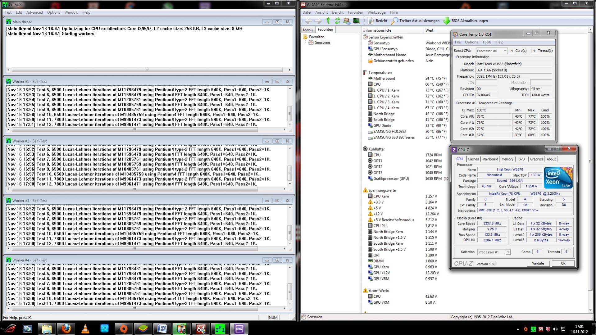 Bräuchte mal eure Meinung zu den werten. Habe einen I7 920 gegen einen Intel Xeon W3570 getauscht. Ich war dann doch sehr überrascht von den Kerntemperaturen. Als Kühler dient ein Dark Rock Pro C1. Wenn ich HT hinzu schalte, kommen nochmal 5-7° drauf. Laut diesem Test bin ich mit meinen Temps ca. 10° drüber. Ach ja, für den Test habe ich die Heizungen aus und Fenster auf. Es war recht Frisch im Zimmer. Ansonsten wären die Kerne bei über 80°. Ich finde für den Kühler, sind die Temps doch schon höher wie normal. Zumal ich mit dem i7 920 @ 3,3GHz bei 60-68° blieb.