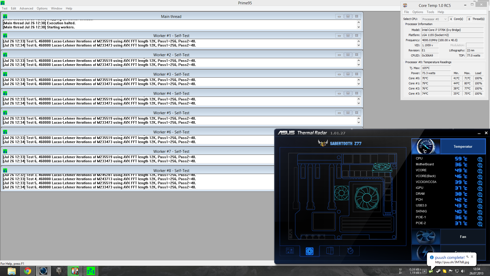 Ich glaub meine Temparatur ist etwas zu hoch. Nach 2 Minuten Prime 95 hat sich mein System aufgehängt. Diese Screenshots konnte ich noch machen. Meine CPU taktet auf 4201 MHz. Dabei habe ich den Overclocking Genie II in meinem Mainboard doch schon deaktiviert. Als Kühler nutze ich den der beim Prozessor dabei war. Prozessor ist ein Intel i5 3570k