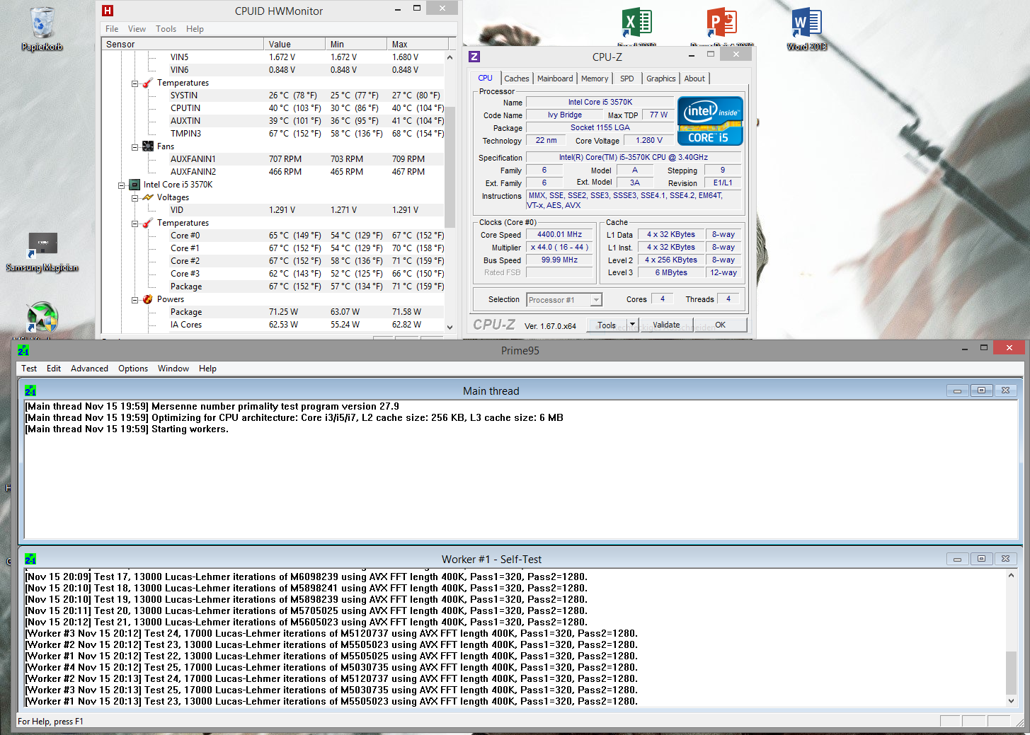 Dann prime95 gestartet und nach ca. 10 Min. die Werte (Vollauslastung) ermittelt.