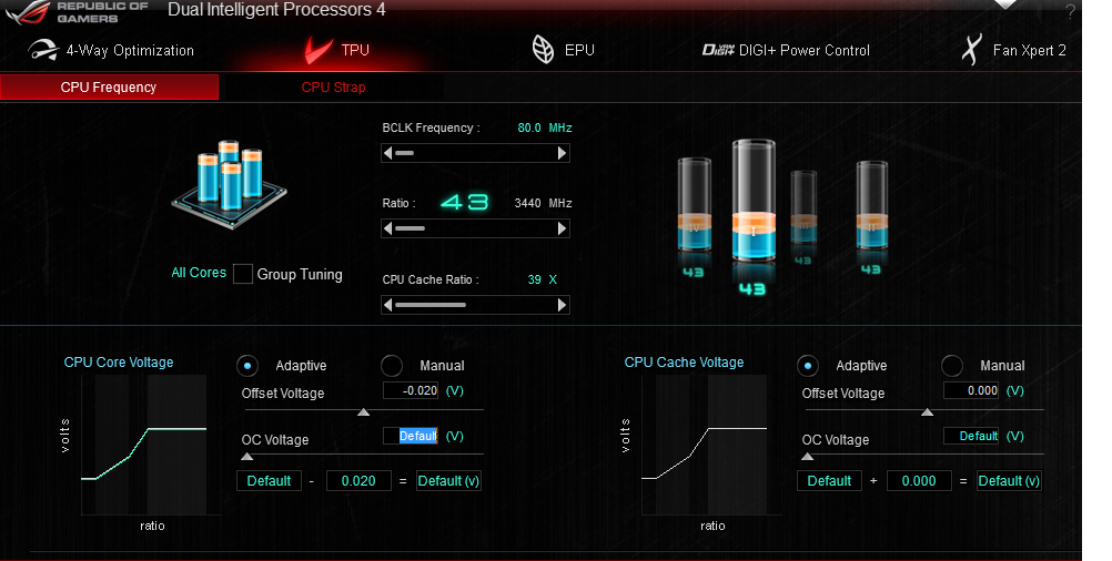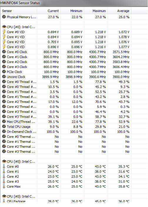 habe meinen Haswell i7 heute bekommen (war ein gebrauchter) und beim Multi wurde daher schon etwas rumgespielt, sodass 4,2GHz angelegt waren. Habe nun den Multi testweise auf 43 auf allen Kernen erhöht, Offset liegt bei -0.020V AI Suite zeigt mir hierbei eine aktuelle Spannung von 1,18V, HWinfo ein Maximum von 1,218V an.
