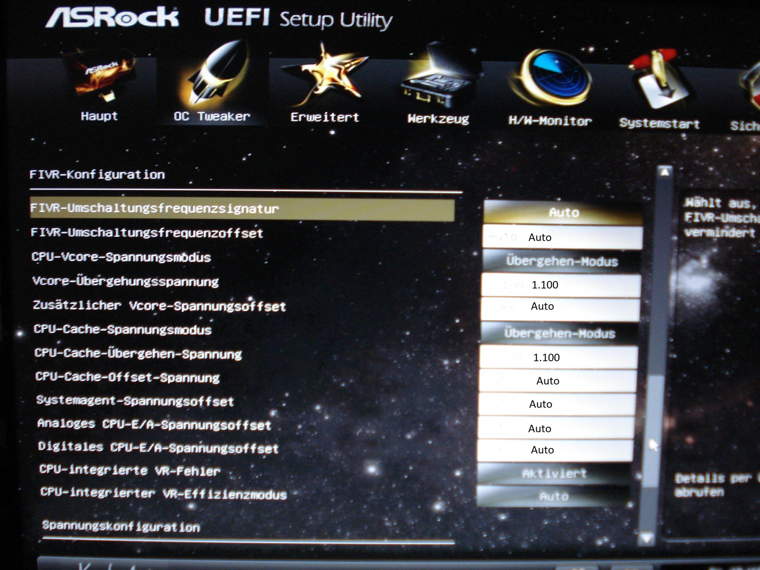 da mein erstellter Thread leider geschlossen wurde, was ich seh schade finde, hier mal meine aktuellen Erkenntnisse zu meiner Übertaktung (i5 4670k + asrock z87 extrem4). Ob die Settings 100% laufen weiß ich noch nicht, der Intelburntest lief sauber durch. Games teste ich dann heute, da fehlte mir gestern die Zeit.