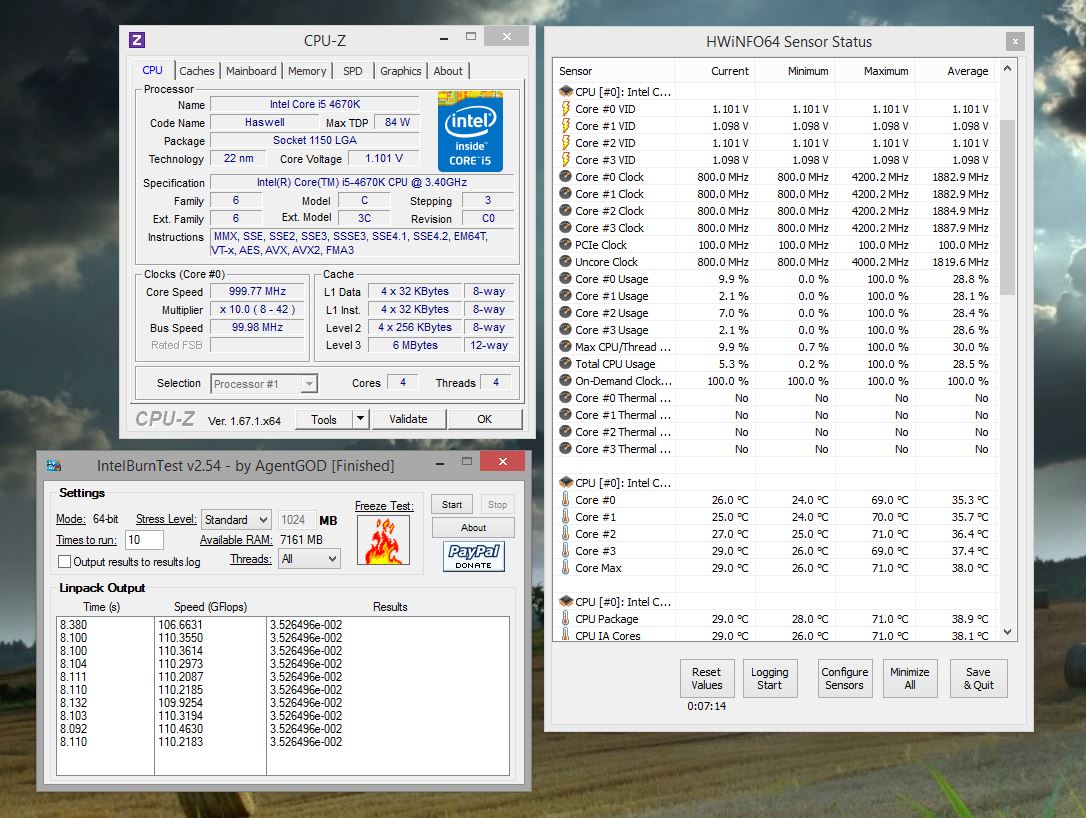 Wenn ich den Rechner Starte und sofort CPUz öffne zeigt er mir die 4.0ghz an bei einem Vcore von 1.096v, starte ich den Intelburntest geht der Vcore auf 1.224v und die bisher maxiemale Temparatur liegt so bei 76°C. Wird heruntergeregelt, also auf 800mhz gestellt liegt der Vcore noch bei 0.074v. Ich hatte mal versucht 4.2ghz mit diesen Einstellungen aber da friert mir beim Intelburntest der Rechner ein.