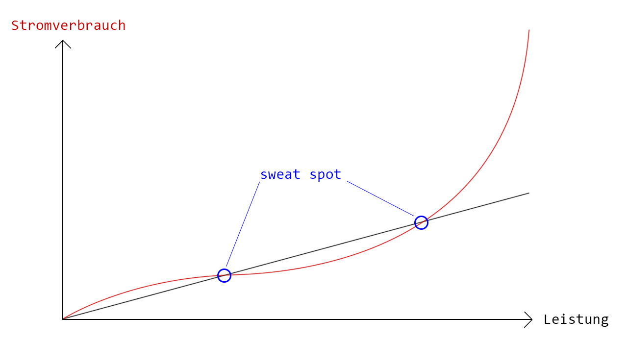 Die höchste Effizienz hast du am sog. sweat spot, süßer Punkt, an dem das Verhältnis von Leistung/Stromverbrauch am höchsten ist.