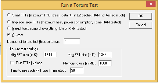 Für den Start 1344k Run um die Vcore auszuloten mal 1-2 Stunden laufen lassen (Custom auswählen, Haken bei Inplace setzen und bei min und max 1344 einstellen).