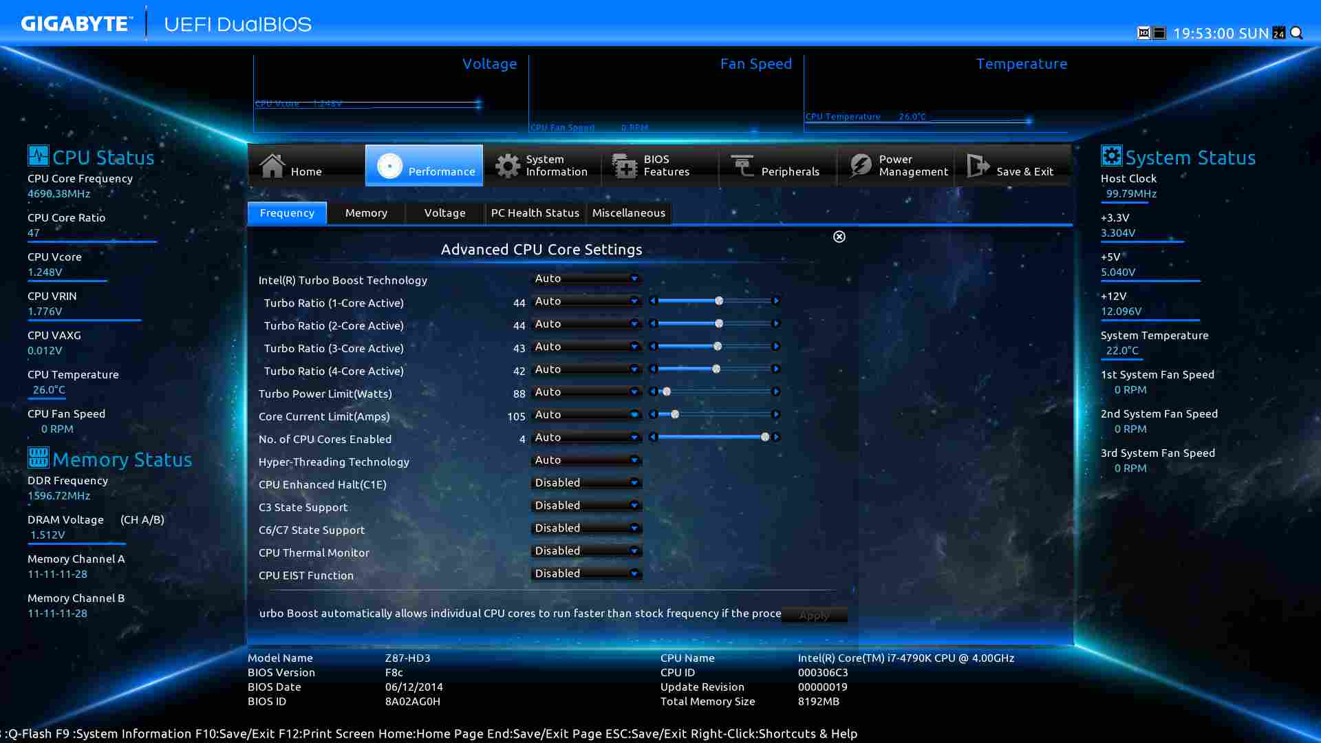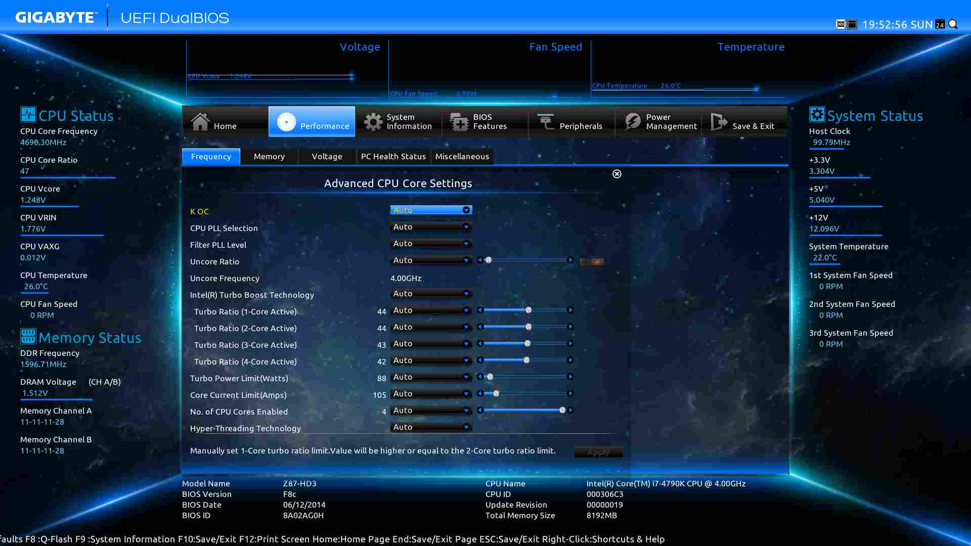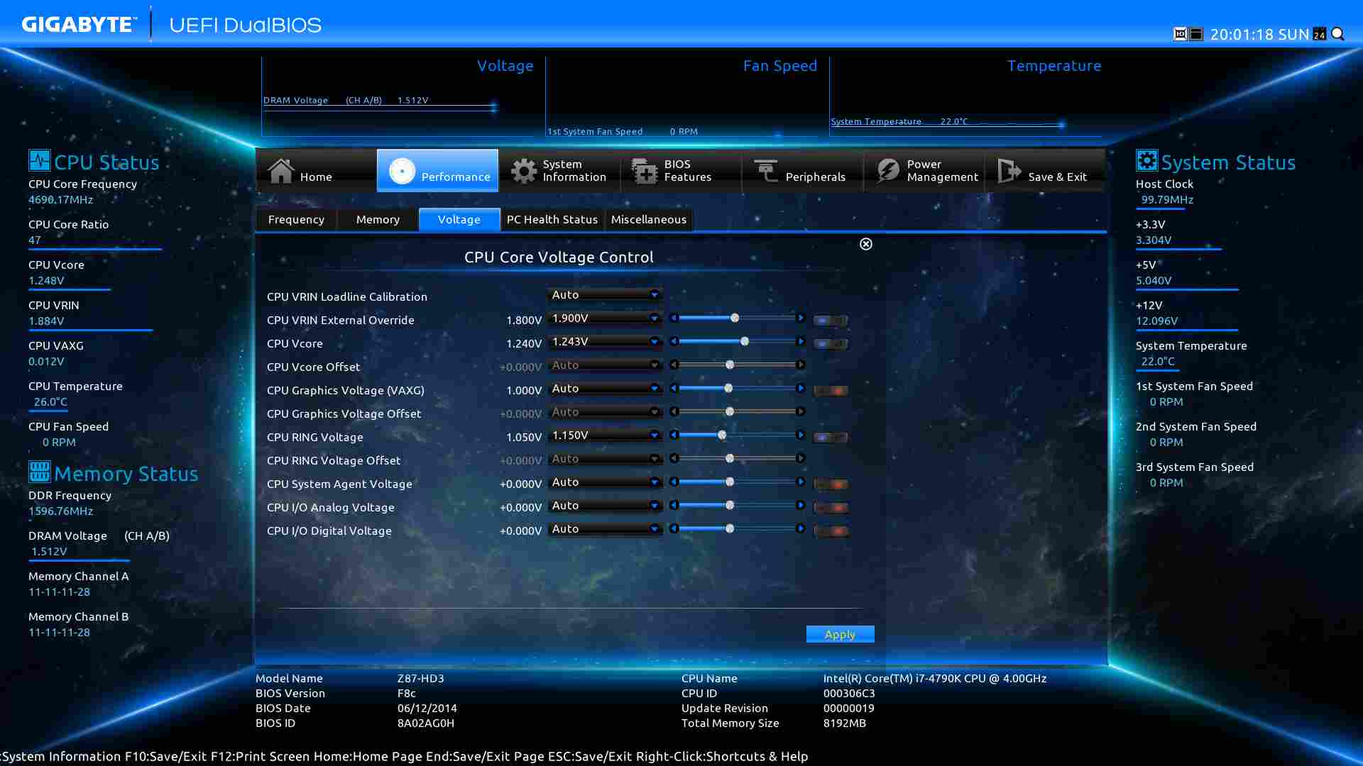 Die RIN oder Input-Voltage sollte fürs Erste auf 1,90 V. Ich denke, das braucht das Board für 4,7 GHz. Zum Feintuning kommen wir noch.