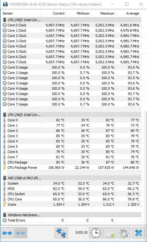 Daraufhin habe probiert an der Spannung zu spielen, um die Temperatur ein bisschen runterzubekommen. Ich habe das Teil auf 1,27 @ 5 GHz bekommen, sodass der REchner auch bootete. In Prime95 habe ich den Small FFT Test mit deaktiviertem AVX gestartet. Nach etwa 5 Minuten machte sich Instabilität breit sodass der Rechner dann abstürzte. Nun bin ich auf 1,29V @ 5 GHz, dann läuft Prime95 durch ohne Absturz, Temps halten sich bei 85 C°, vCore steht dann bei HWinfo allerdings auf 1,328 V, obwohl BIOS 1,292V anzeigt.