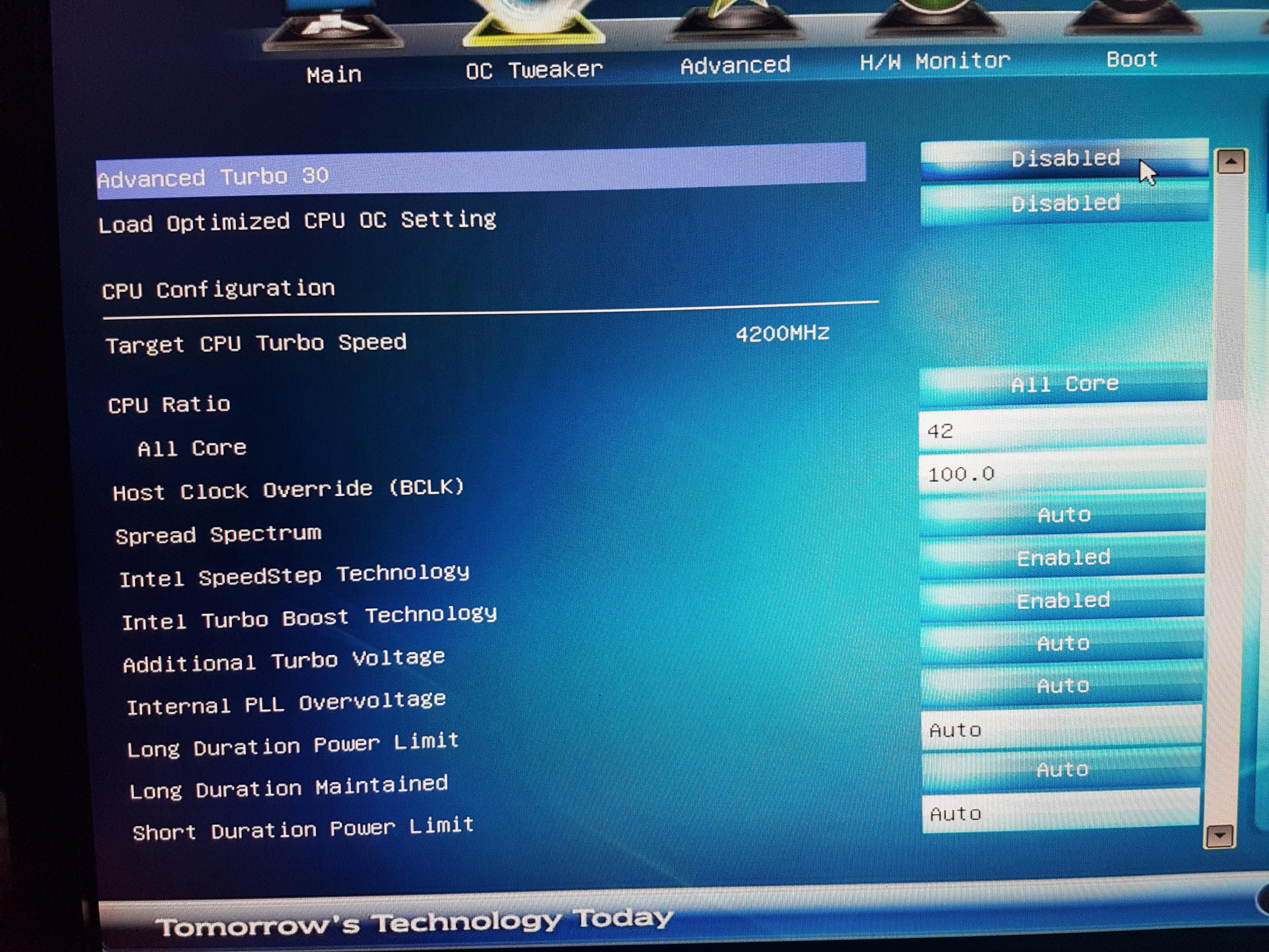 Wie man schön sehen kann, ist es direkt im Bios nur möglich mit einer positiven Offsetspannung zu regulieren. Im Clickbios wird mir zwar eine richtige Spannungsregulierung angezeigt, allerdings interessiert das das Board nicht die Bohne. Egal was ich dort einstelle, es wird zwar scheinbar übernommen, allerdings nicht eingestellt und beim nächsten booten stehts auch wieder auf 0.0V. Alle anderen getesteten Optionen funktionieren jedoch, so kann ich auch wunderbar einfach nur den Boost der 4 Kerne auf 42 stellen und die CPU taktet nur bei Bedarf auf 4,2 GHz - nur eben mit der Spannung die das Board gern hätte.