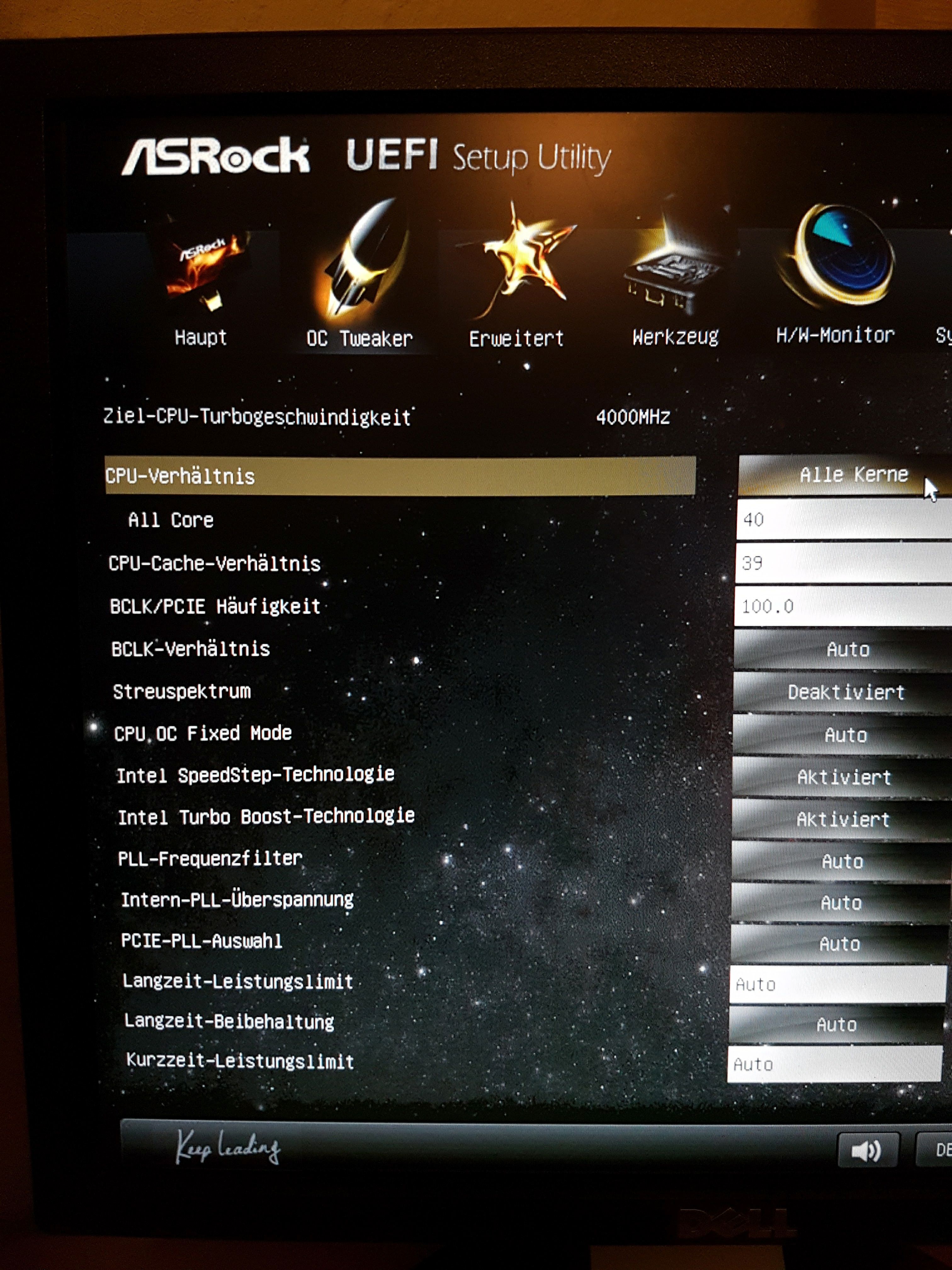 nach all den Jahren wollte ich jetzt mal mein i5 4570 k auf dem Asrock Z87 Pro 4 übertakten. Als Ziel hab ich mir erst mal 4 GHZ gesetzt. Leider habe ich das Problem, das mit den angehängten BIOS-Einstellungen der Core Voltage laut CPU-Z selbst im Idle (800 Mhz) nicht unter 1,119 V fällt. Ohne Übertakten fällt er im Idle bei 800 Mhz auf 0,709 V. Außer CPU-Verhältnis im 1. Screenshot und CPU-Cache-Verhältnis habe ich fürs Übertakten nichts verändert. Hat jemand eine Idee?