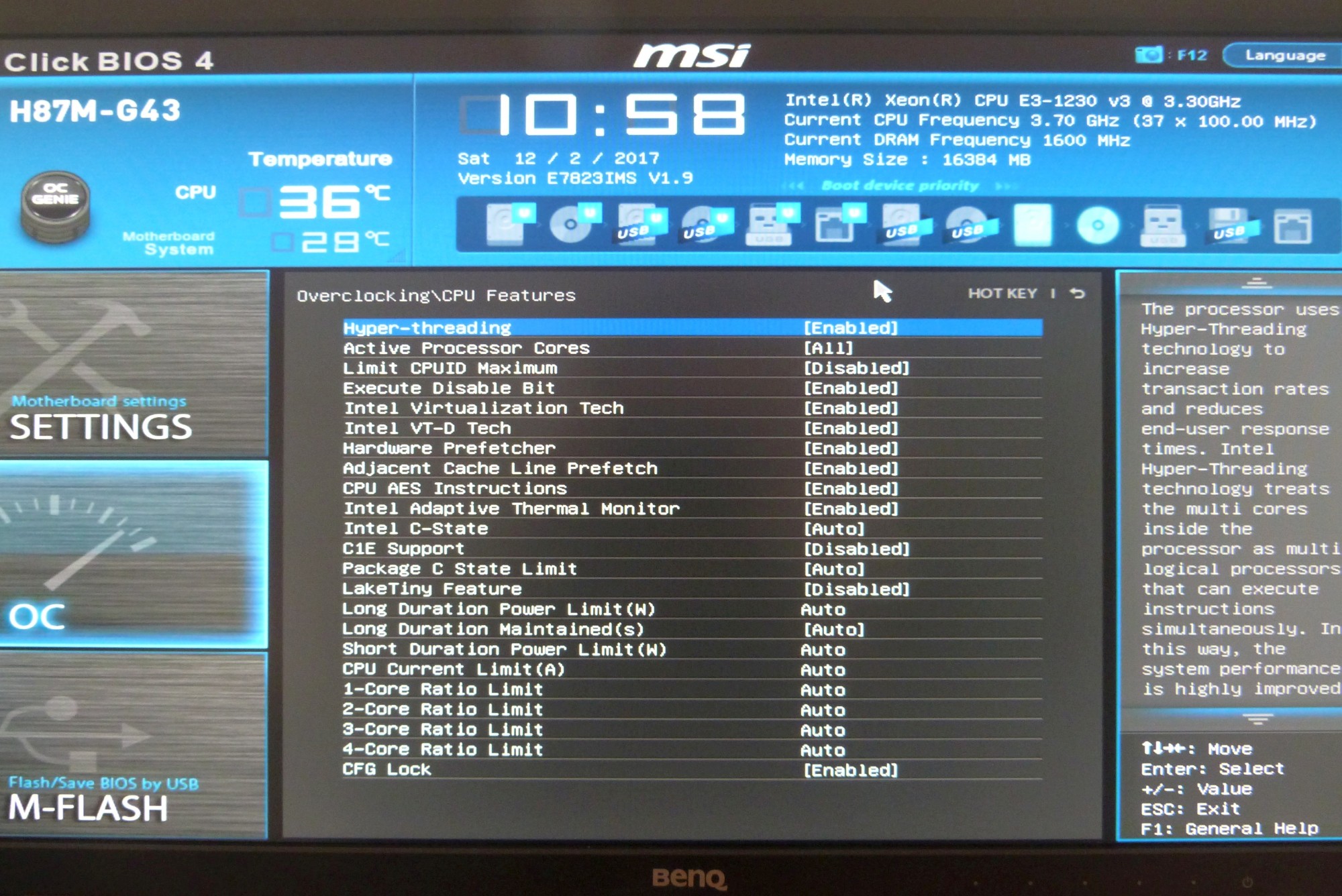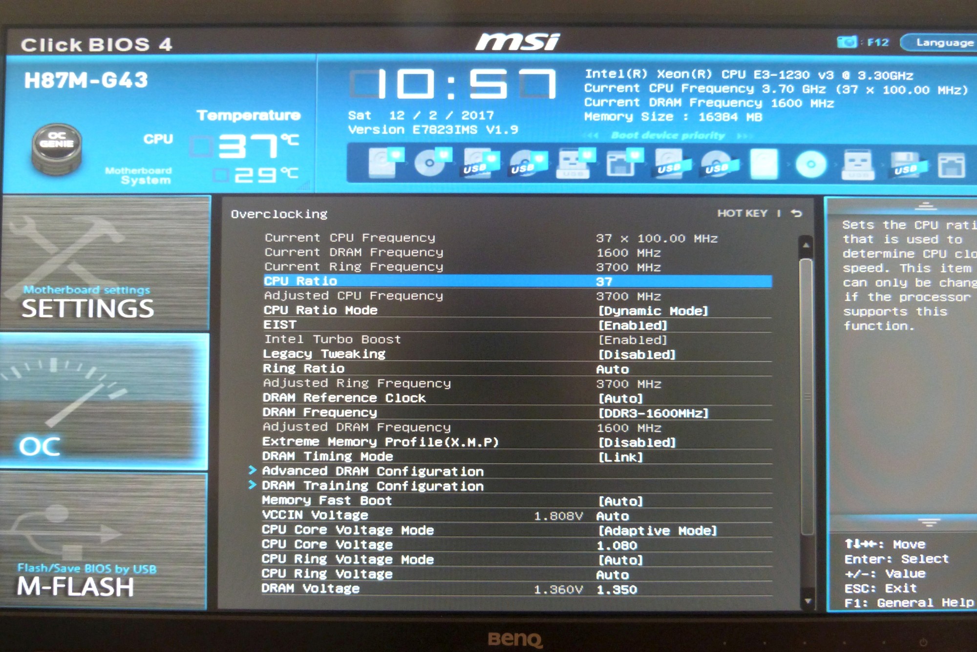 Ich habe mittels CPU Ratio und CPU Ratio Mode den allcore turbo auf 3,7 GHz eingestellt, was zu meiner Überraschung auch funktioniert. Ich dachte eigentlich, das ginge nur mit älteren Microcodes bis max. 306C3/7, hier auf dem Board ist aber das neueste Bios mit 306C3/19.