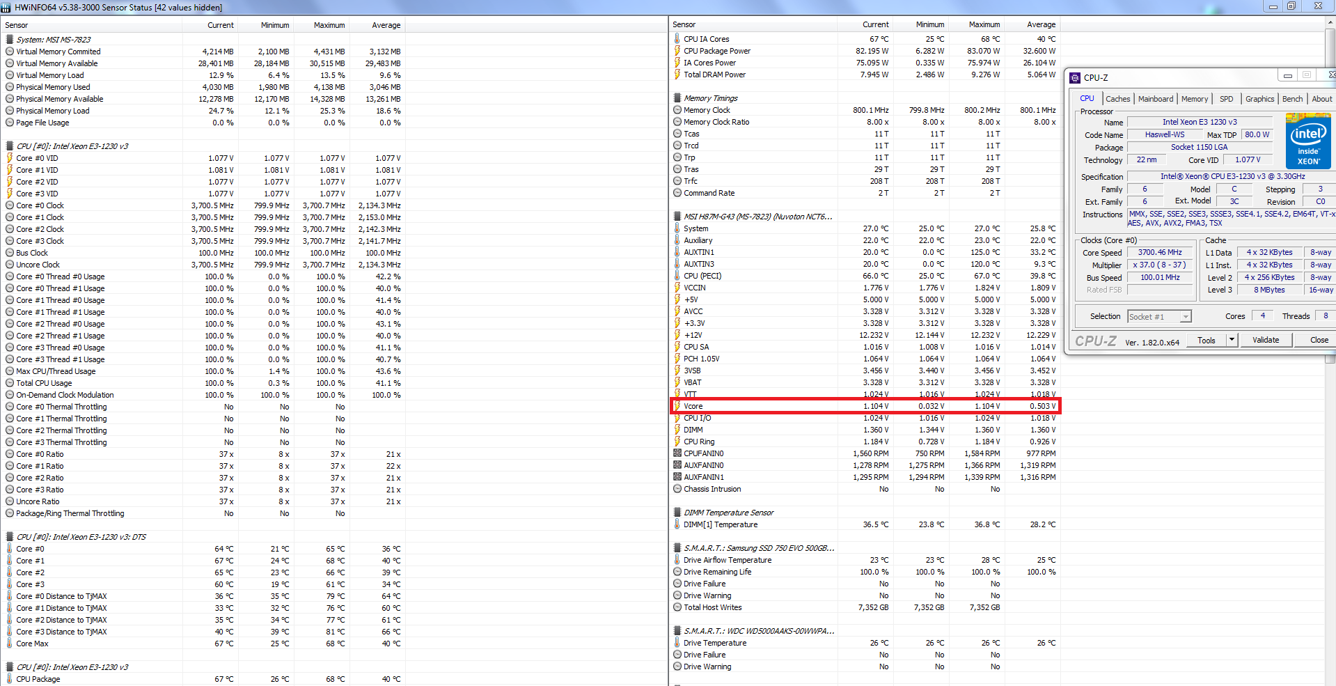 Ich habe hier noch ein paar Pics von den BIOS-Einstellungen und HWInfo mit laufendem Prime95. (System läuft so stabil, hatte Prime über Nacht laufen...da kann ich mit der Spannung wohl noch ein klein wenig runtergehen)