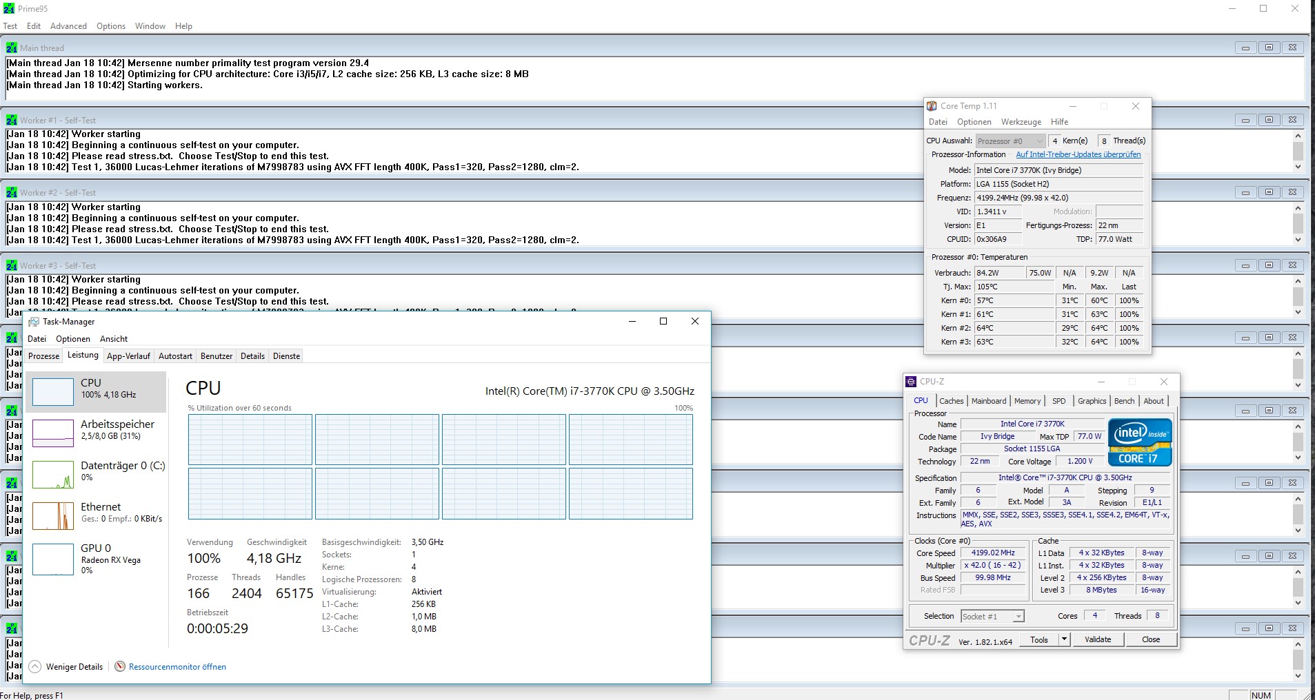 Bin jetzt auf 4,2Ghz gegangen, nichts weiter verändert. Die Temp unter Prime geht jetzt bis 65Grad hoch und die Vcore liegt lauf Cpu-z auf 1,2V.