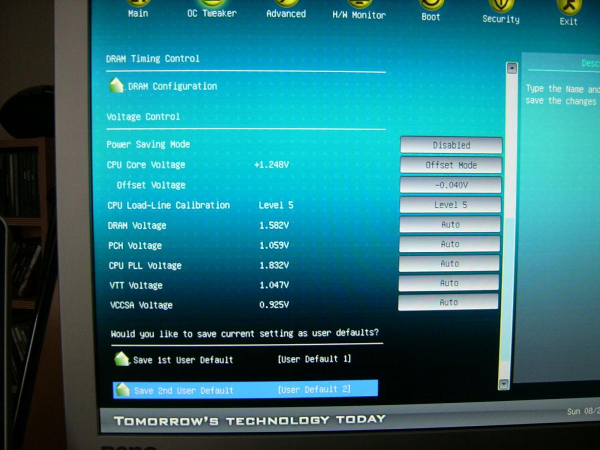 Könnt ihr mal meine Bioseinstellungen überprüfen. Ich hab 2 Fotos von meinem Bios gemacht. Ich fahre meinen 2500K mit 4,5 Ghz. Dabei hab ich im Idle 0,904-0,912v bei 31-35° und mit Last 1,224-1,232v bei 57-60°. Läuft über eine Stunde mit Prime ohne Fehler.