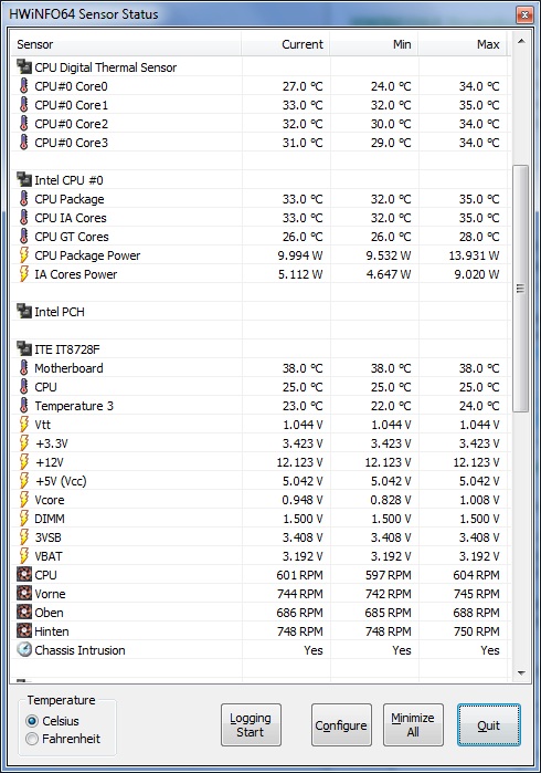 Also bei manchen Usern zeigt CPU-Z die richtig VCore an. Bei mir aber nicht, sondern nur die QPI/Vtt Spannung. Die liegt bei 1,044V und steigt bei Last auf 1,056V.