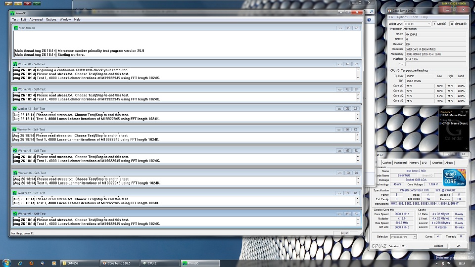 Hier noch einen Screenshot (Prime ist nur kurz an gewesen, aber aus längeren Test weiß ich das die Temp dann stabil bleiben. Welche T ist für den I7 ok? Ist nach den Werten mein Kühler richtig drauf? Das Gehäuse ist ein CM 690, ein langsamer Frontlüfter, ein PWM Bodenlüfter und ein langsamer Hecklüfter sind drinnen. NT (OCZ ModXStream Pro 600W) kühlt nur sich selber.