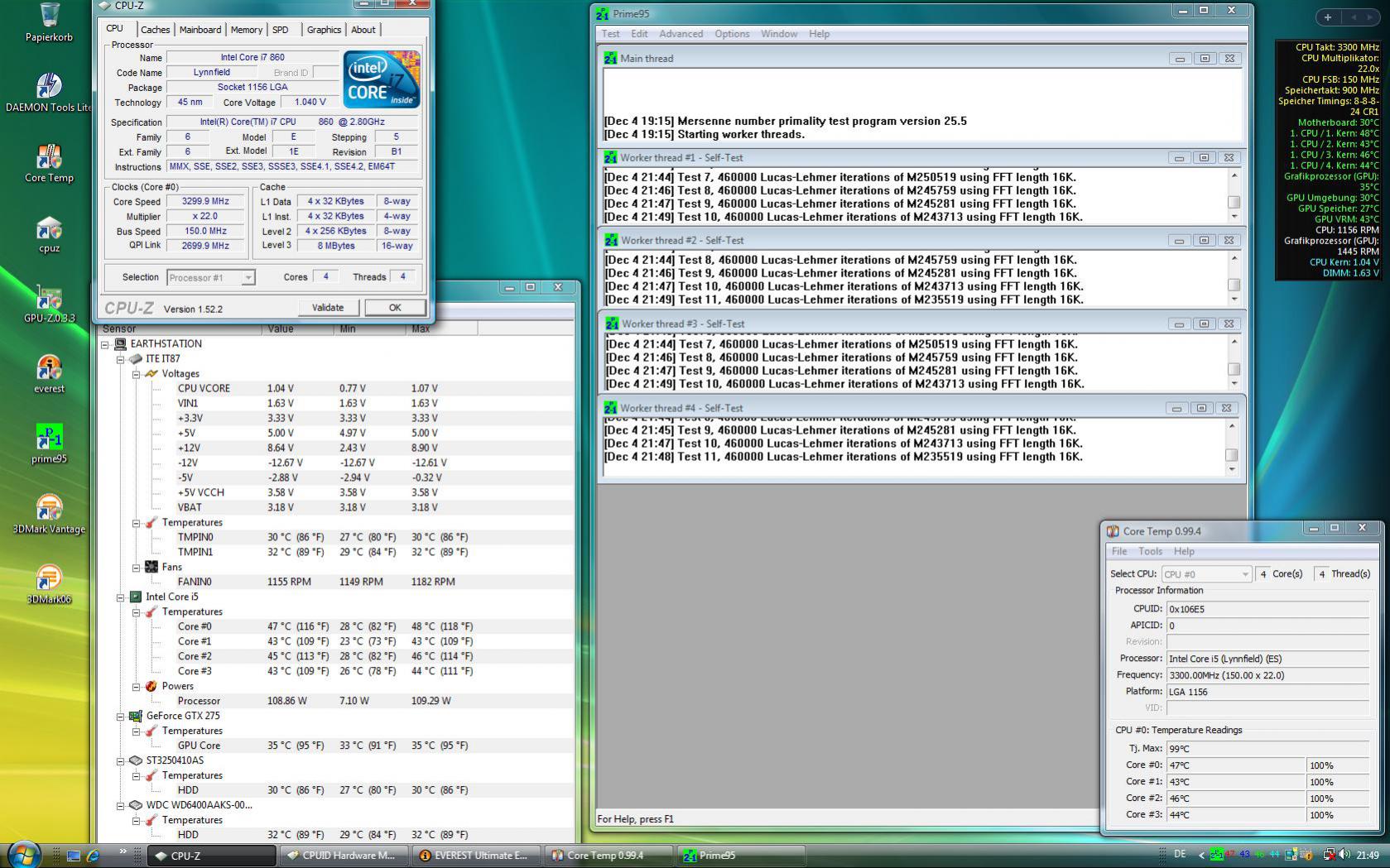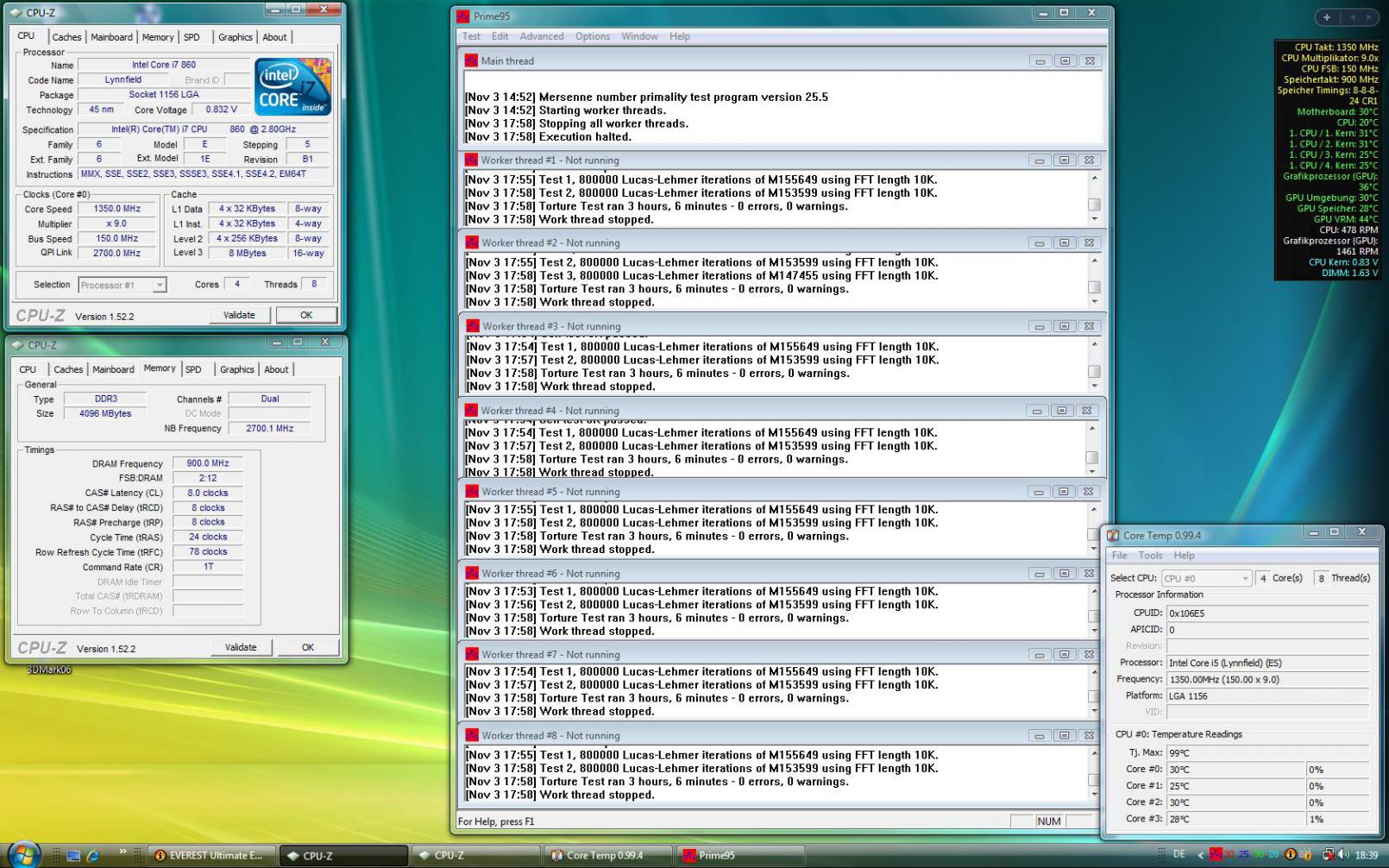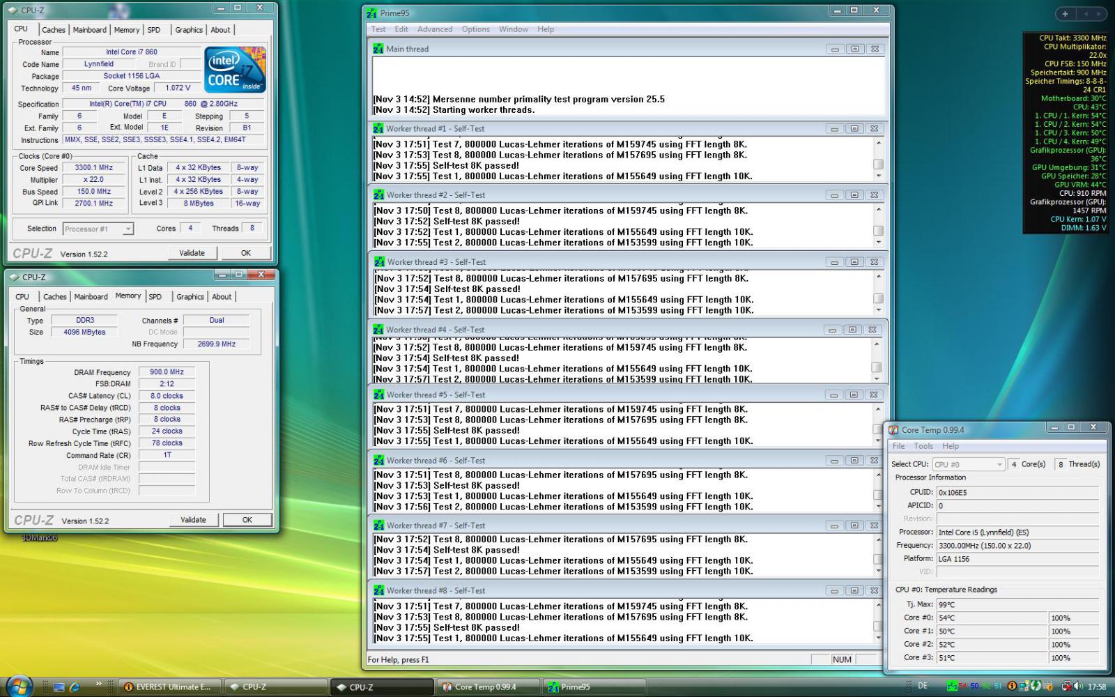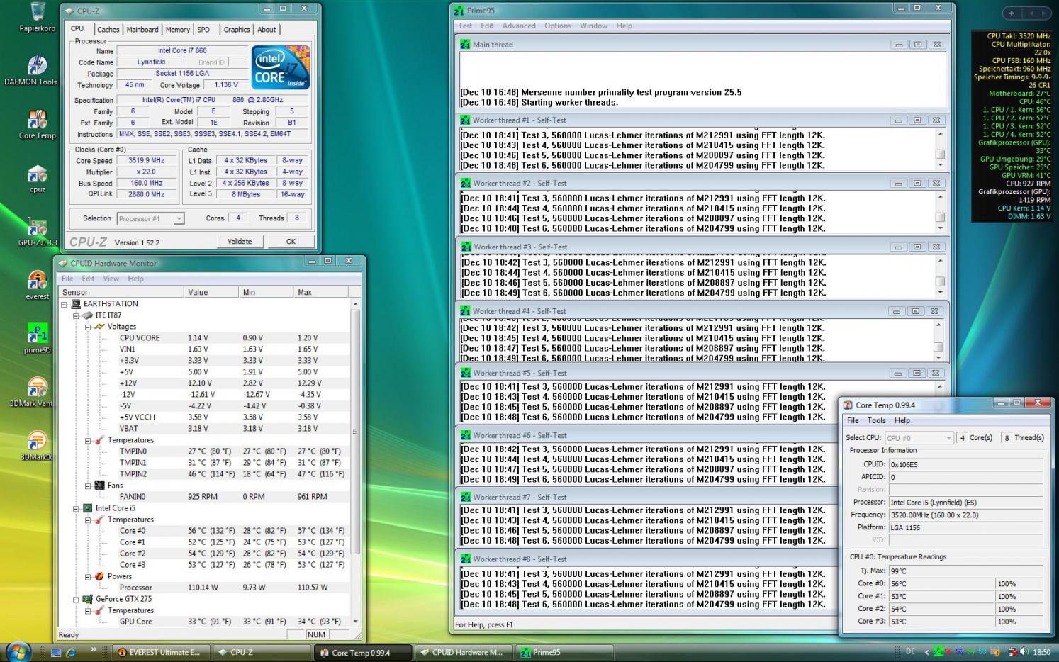 Spannung auf 1,15V runter bei 3,10 GHz (155 x 20) - Pirme läuft seit 10 Minuten und Temps sind so zwischen