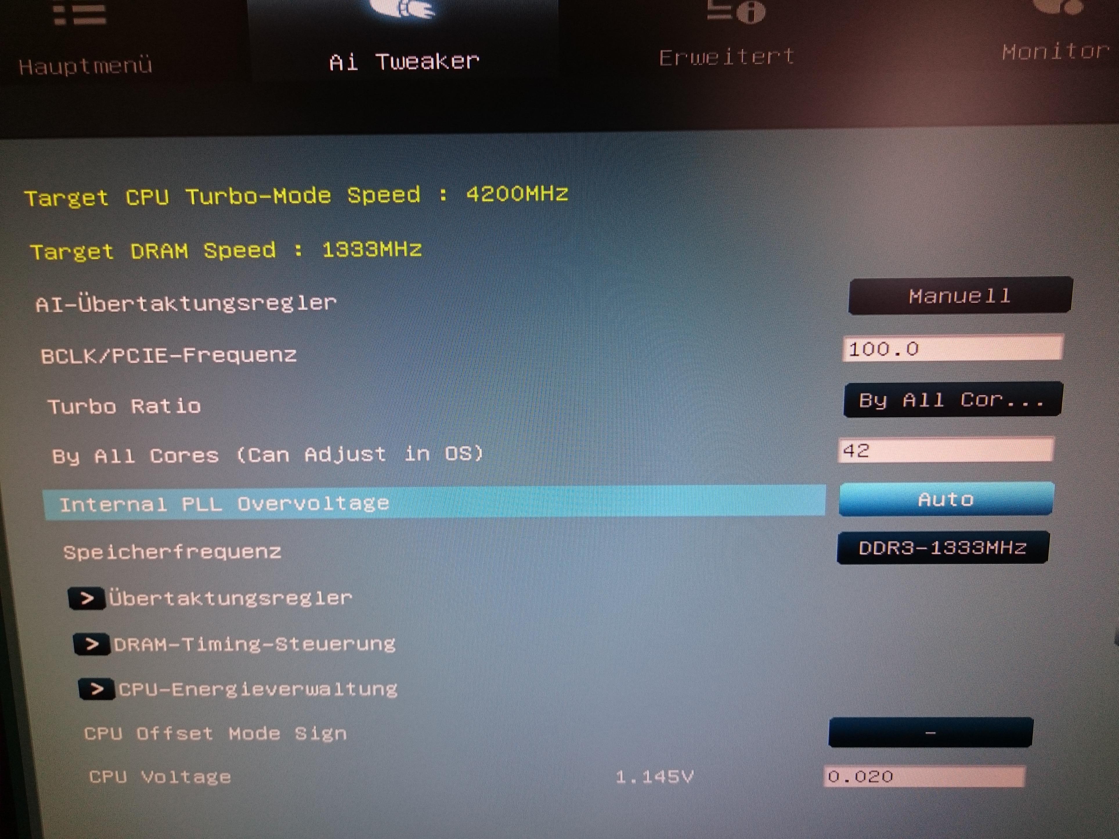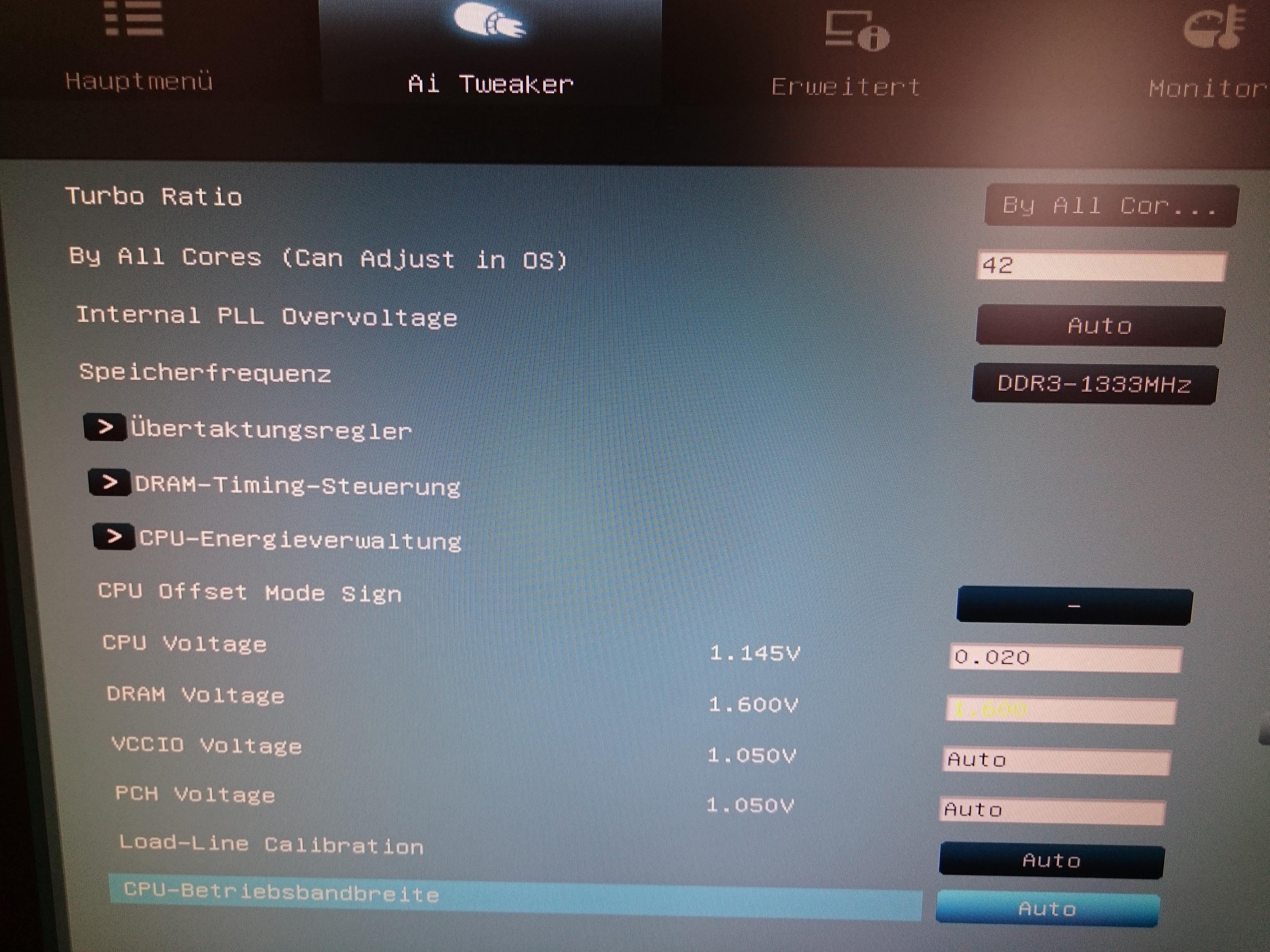 Versuche ihn jetzt auf 4,4 GHz stabil zu bekommen. Läuft gerade auf 1,296V (LLC-Level 5, d.h. noch leicht höhere Vcore im Idle), ist mir eigentlich ein bisschen hoch, aber gut noch keine 1,3V überschritten, also meine Marke noch nicht erreicht. Gehe ich mit Vcore runter, erhalte ich 0x124-STOP, also scheint das eine Art Grenze zu sein. Zur Not muss ich halt auf 4,3 GHz runtergehen, auch wenn 4,4 schöner aussieht