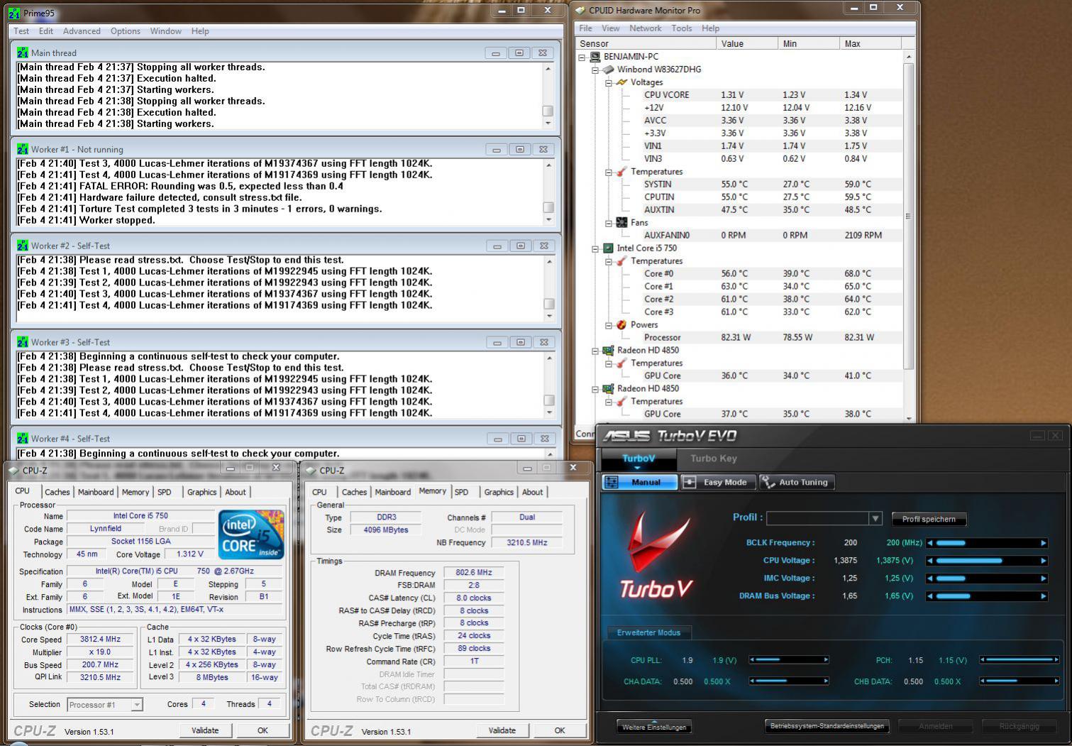 Dann wollte ich nochmal alles mit Blend testen, kriege aber nach ein paar sekunden immer beim 0. Core einen Fehler. Dann hab ich mit TurboV alle Volt hochgetrieben, nix gebracht, dabei waren CPU-V, IMC, PCH und CPU-PLL, alles nix gebracht! Siehe Screen!