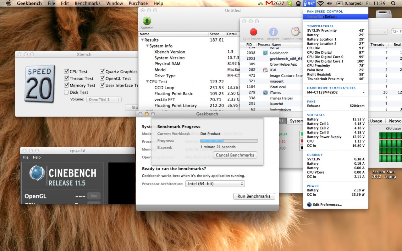 Die letzten Tage habe ich mit einer Corsair H100 (kleine Wasserkühlung mit 2x 120er Radiator und SilentWings anstatt der Standardlüfter) rumgespielt. Die Temperaturen gingen gegenüber dem Noctua NH-D14 im Leerlauf um ca. 5 °C zurück, unter Last hat sich der Unterschied auf etwa 10 °C erhöht. Also an und für sich schon super, ich denke mal die H100 konnte u.a. davon profitieren, dass sie Frischluft vom Gehäusedeckel ansaugen kann, im Gegensatz zum Noctua der die etwas aufgewärmte Luft im Gehäuseinneren nehmen muss. Trotz der guten Temps und geringen Lautstärke der Silentwings geht die H100 jedoch leider wieder zurück, da die Pumpe ein permantenes aber unregelmäßiges Schleifgeräusch produziert. In der Horizontalen ist die Pumpe komplett lautlos und wäre echt super, aber sobald sie vertikal am Mainboard hängt ist sie einfach nur laut und deutlich über die Lüfter hörbar. Um das Geräusch zu unterdrücken müsst ich die lauten Corsair-Standardlüfter auf 3000 rpm aufdrehen, und die sind wirklich verdammt laut. Echt schade drum, vom Konzept und auch vom Preis find ich diese closed-circuit WaKüs schon interessant, und die Kühlleistung scheint auch zu stimmen. Aber zumindest bei Corsair gibt es wohl bei der H80 und H100 Probleme bei der Qualitätssicherung, denn offenbar besitzen selbst neue H100, die über Corsair ausgetauscht wurden, dieses Schleifgeräusch.