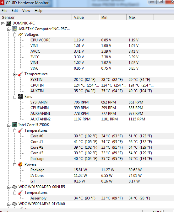 Auf meinem CPU: Intel(R) Core(TM) i5-2500K CPU @ 3.30 GHz liegt eine Wasserkühlung von Asteke.