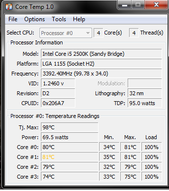 Also, meinem Kumpel, der sich eine i5 2400 jetzt zugelegt hat (danke nochmal für die, die ihn dabei beraten haben), werden neben den 4 "Kerntemperaturen" noch eine weitere "CPU" Temperatur angezeigt. Diese ist im IDLE sehr oft auf 80°C und höher, bei Last geht sie oft runter auf bis zu 40°C - siehe 2. Bild.