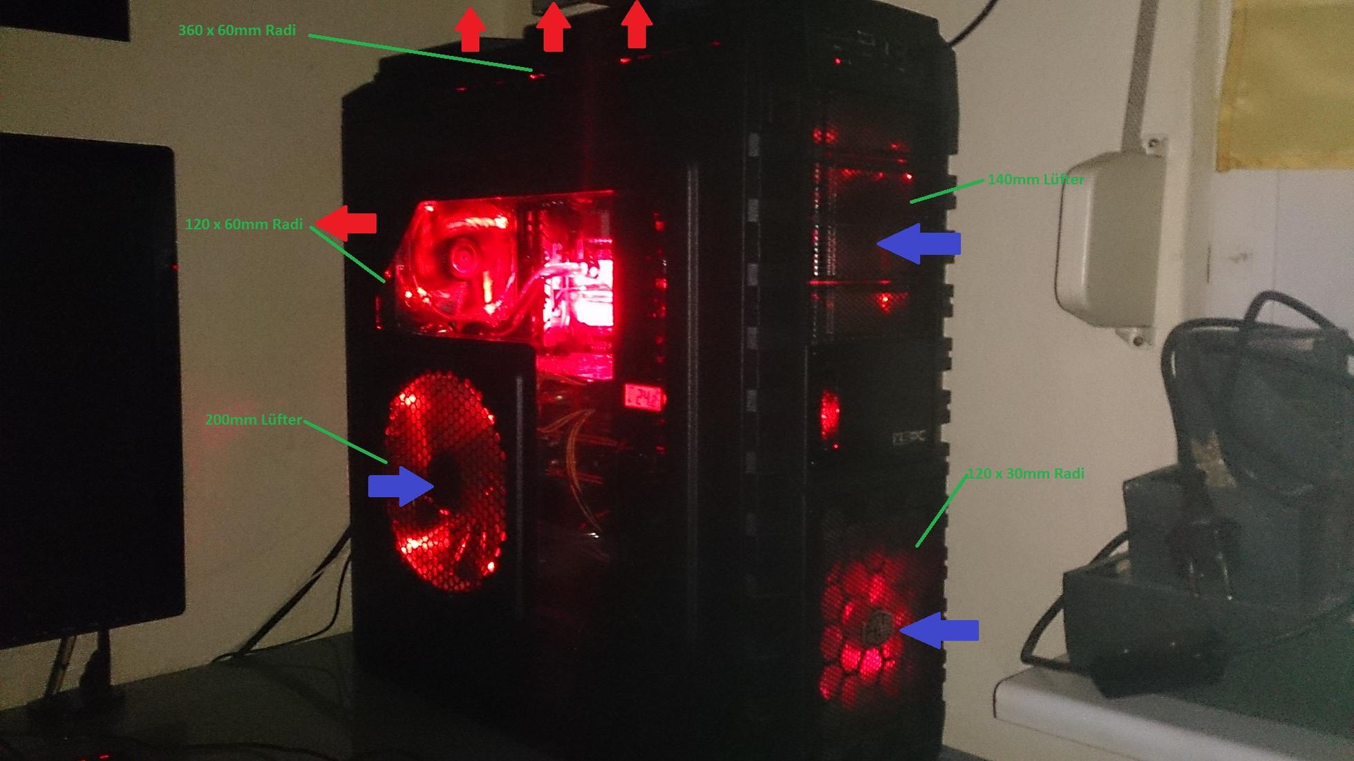 Ich habe die 3x 120er Lüfter vorne einsaugend vor der dem 360er Radiator installiert. Oben im Case bläst ein 140er in das Case rein und hinten saugt ein 140er raus.