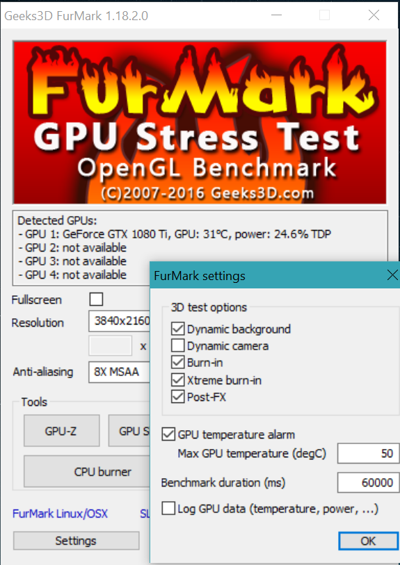 Ja@ V3nom," nur" durch Furmark. Hab die Einstellungnen mal gescreenshottet...Die CPU-Auslastung bewegt sich bei Furmark zw. 17-23%
