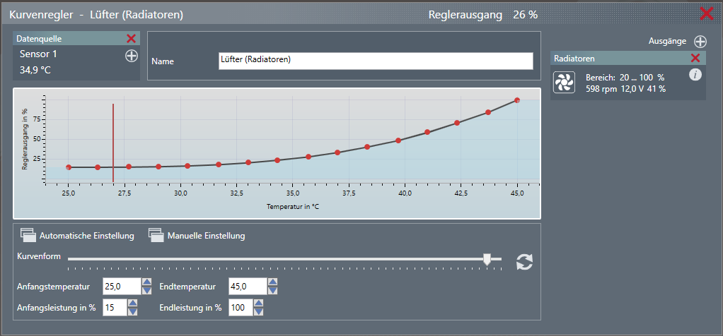 Erst ab 35° gehen bei beiden Radis die FANs auf fix 700rpm.