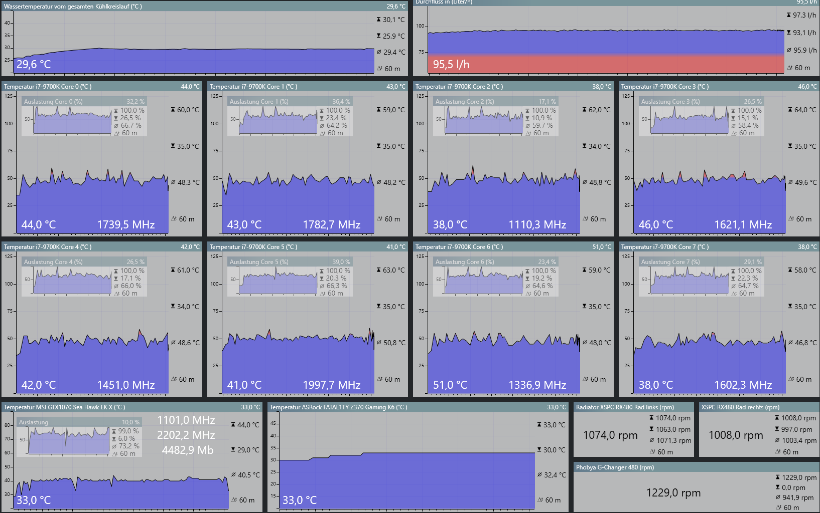 Hab Grad Aida64 durchlaufen und das Wasser ist bei 29 Grad, die CPU bei 72 Grad. In Games eher um die 60.