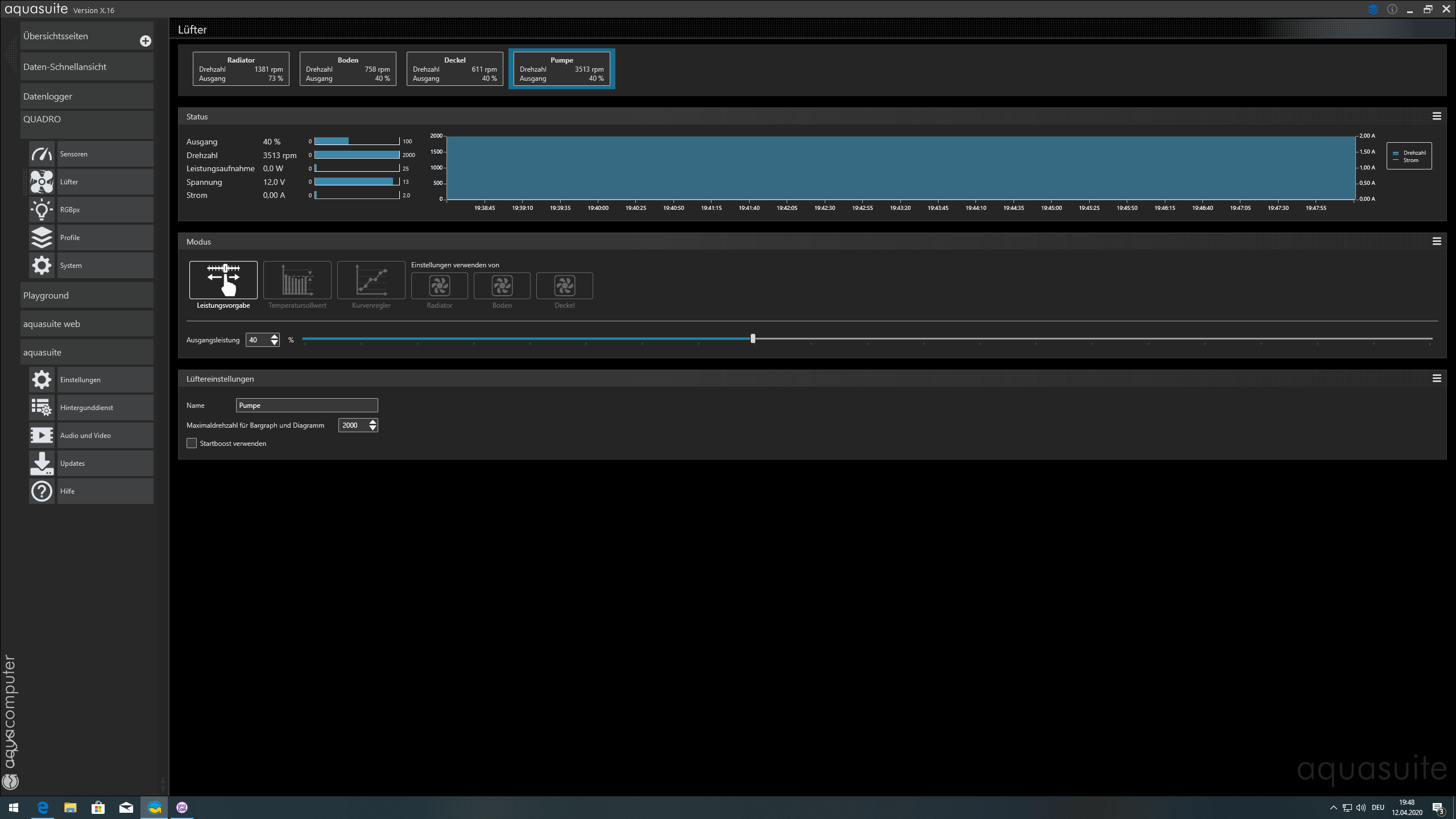 Die D5 Pumpe ist am Netzteil angeschlossen und der PWM Stecker am Quadro.Der Quadro bzw. Aquasuite zeigt mir die Werte der Pumpe so an. Jetzt habe ich die Leistung der Pumpe auf 40 Prozent reduziert,hat aber immer noch eine Drezahl von 3500 rpm.