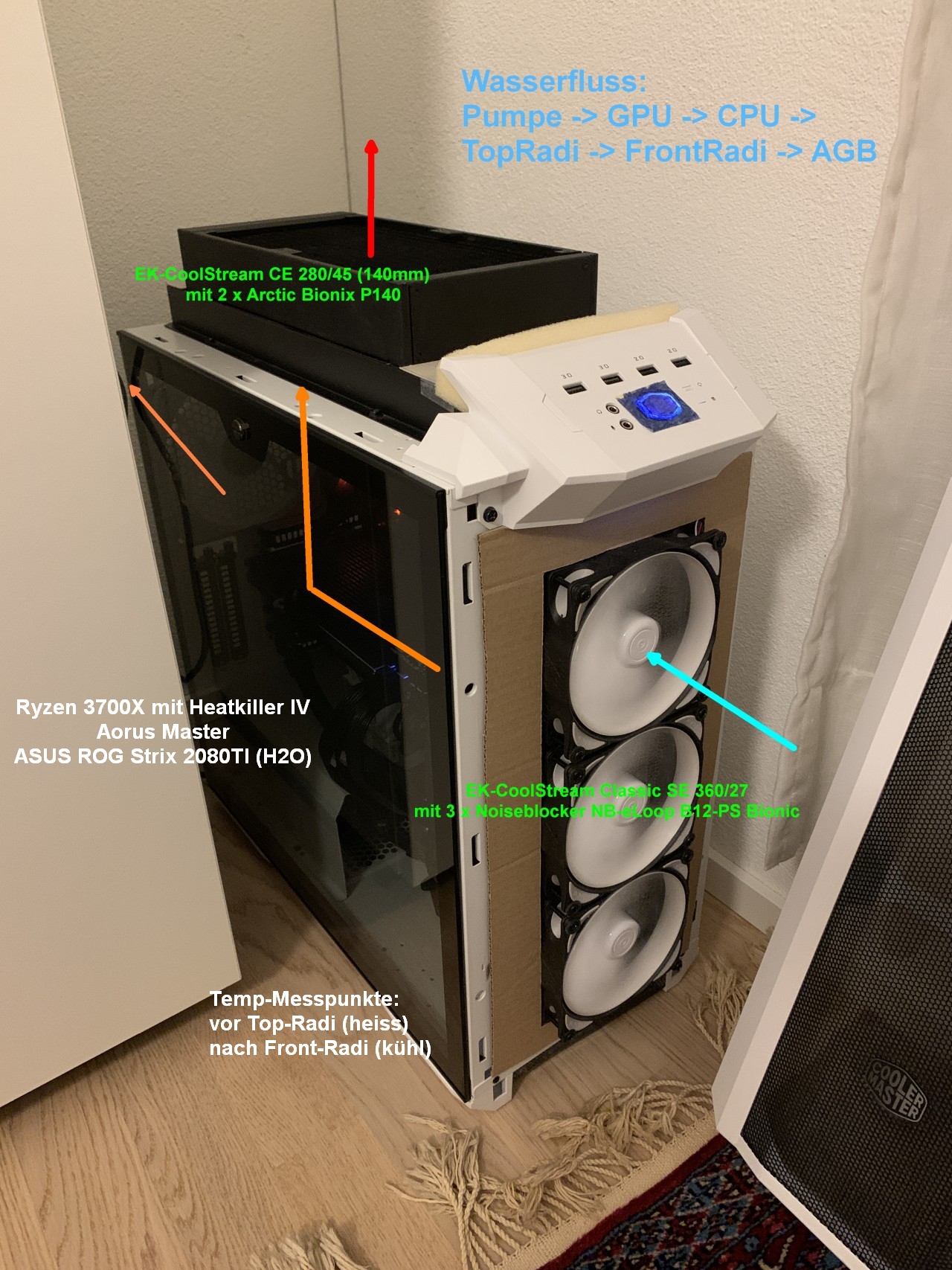 Hallo zusammen, würde gerne eine Einschätzung von euch haben, ob die Temperatur meiner Komponenten in Ordnung ist oder ob meine Wakü zu schwach dimensioniert ist für meine Ansprüche (Lüfter auf ca. 1200rpm unter Last). Dachte mir, ich frage zuerst hier nach bevor ich einen extra Thread erstelle und es nachher heißt "die Temps sind eh OK, du brauchst nicht mehr Radifläche".