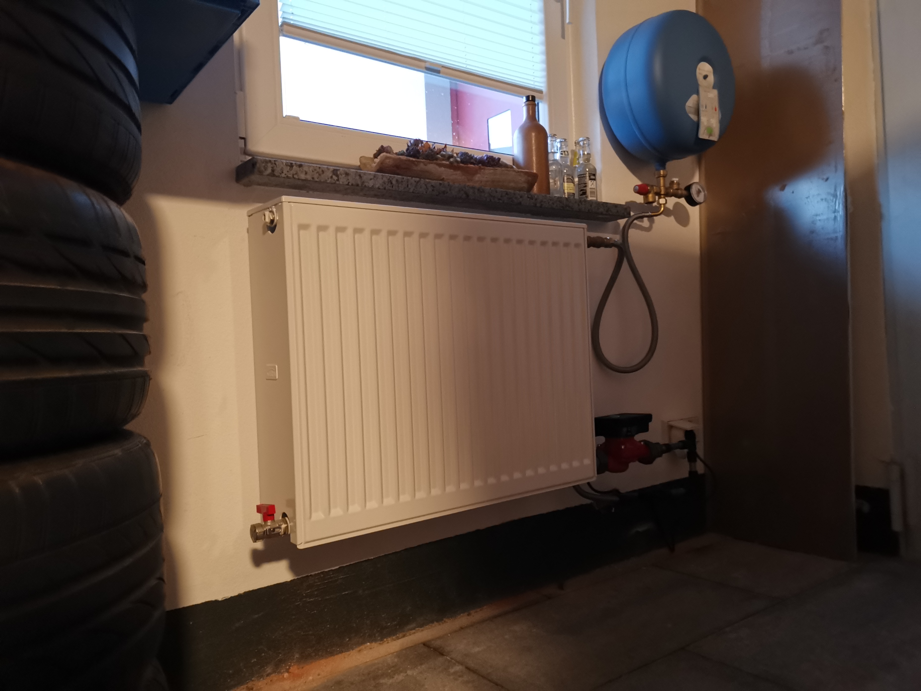 In der Garage habe ich dann einen kleinen Heizkörper, eine Umwälzpumpe sowie ein Ausgleichsgefäß. Die Pumpe wird über eine WLAN Steckdose vom Handy aus geschaltet.