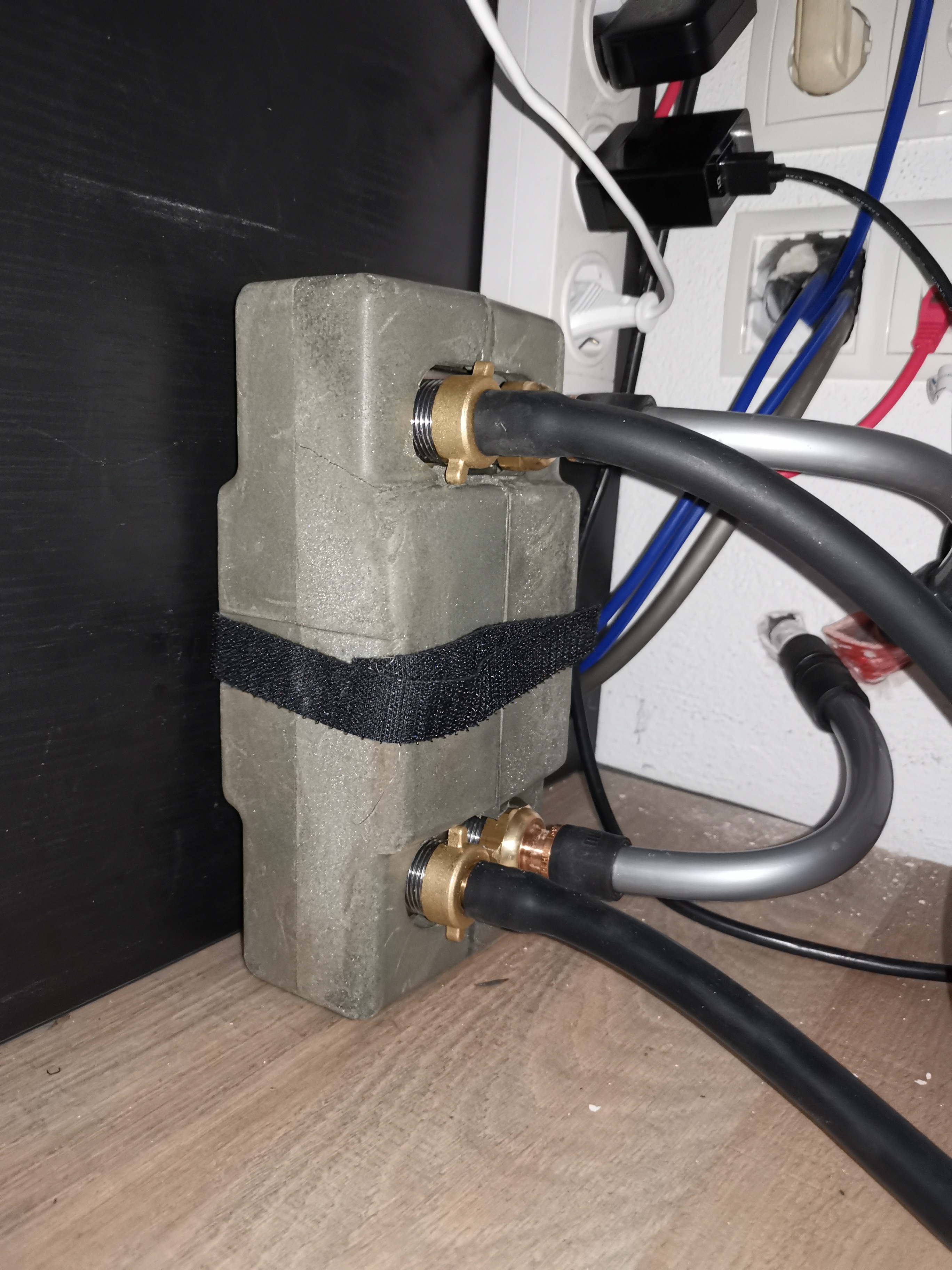 Im Haus beim Stellplatz des Rechners habe ich einen kleinen Wärmetauscher installiert, einmal gehen die Leitungen zum Loop im Rechner über Schnellkupplungen, die anderen beiden Leitungen verschwinden in der Wand.