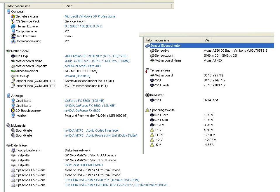 Ich habe seit einigen Tagen ein sehr unerfreuliches Problem. Beim Zocken geschieht es sehr häufig, dass der PC sich einfach resettet. Teilweise friert er auch total ein, dort hilft dann ebenfalls nur noch ein manueller Reset. Ein Freund von mir meinte ich solle mal meine CPU Temperatur überprüfen. Scheinbar ist jene deutlich höher als eure Temperaturen. Es handelt sich um ein PC Komplettsystem, dass ich im Mai 2003 bei LIDL gekauft habe. Wie im Screenshot zu sehen, ist ein Athlon 2700+ eingebaut. Er ist nicht übertaktet oder sonst irgendwie verändert. Das System lief bisher immer äußerst stabil. Ich erinnere mich, dass früher die CPU Temperatur auch schon ziemlich hoch war. Leider kann ich euch nicht mehr sagen, ob das auch ganze 64°C waren. Weniger als 60° waren es aber nicht, wenn ich mich nicht völlig falsch erinnere. Die Temperatur erreicht er im "Leerlauf". Das heißt es läuft nur Outlook, AIDA32, der IE und Miranda. Die Anzeige der "CPU Diode" kommt und geht. Mal erscheint sie in AIDA, dann verschwindet sie wieder. Meist mehrmals pro Minute. Ich habe das Gehäuse bisher nie geöffnet. Da eure Temperaturen so viel geringer sind, kann ich mir gut vorstellen, dass meine Probleme damit zusammen hängen, auch wenn innerhalb des letzten Jahres so etwas nicht vorgekommen ist.