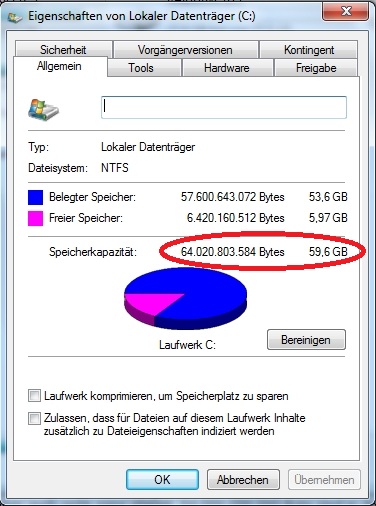 Es sind also 64GiB verbaut, wovon 60GiB (OCZ) nutzbar sind bzw. 64GB (Rest), was in Windows in ca. 60GB resultiert, wobei es eigentlich "GiB" heissen sollte. Ganz einfach