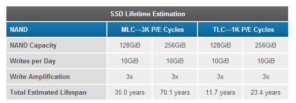 Ja, die MLC sind um etwas mehr als das doppelte langlebiger als die TLC, aber wir sprechen hier von 70,1 Jahre vs. 23,4 Jahre. Für mich klingen 23,4 Jahre bei intensiver Nutzung mehr als genug.