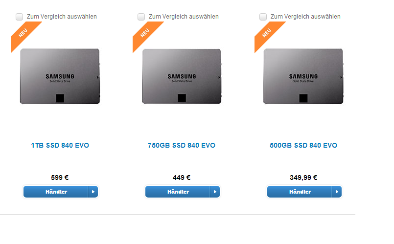Die 840 Basic 500GB ist mit einem Preis ab 282,93€ gelistet, die 840 Evo 500GB ab 281,47€ (also sogar schon billiger) und die 840 Pro 512GB ab 379,09€.